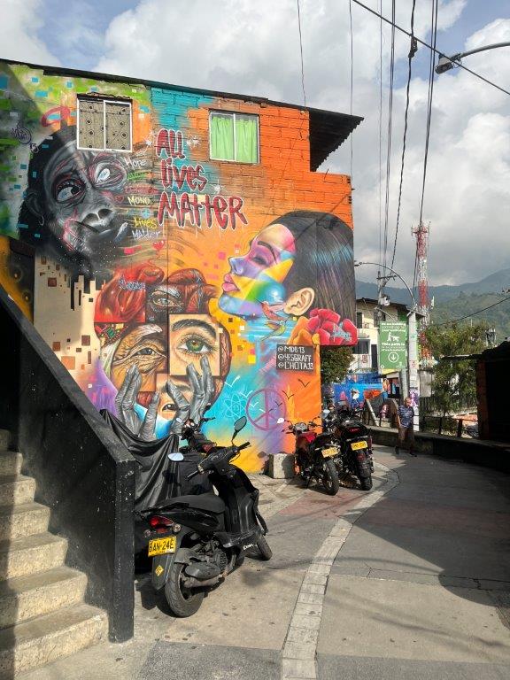 One of the icons of Comuna 13 is the outside escalators. Like most of the outskirts of Medellin the houses are built on the sides of step hills. Wherever the poor people could find a plot of ground that they wouldn’t fall off. There are six covered escalators that ferry people up and down the 384 metre hillside. All free. The houses and steps and alleyways of the rabbit warren are covered with graffiti art.