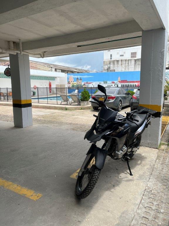 I have to admit that I still find this whole trip scary. Even though I’m well qualified for such an adventure I have waves of anxiety and doubt. Doing it on a motorbike doesn’t help. So I just push on regardless. But I decided not to push on too far and booked a hotel room on the south side of Cartagena for 2 nights. While I am still booked in and paid up in my current place for another week I decided to be able to pack up properly I needed some aircon for me, and a shaded cooler parking place for the bike. The Hotel Mar de Plata fitted the bill and was about $30AUD a night with aircon and a pool. And matching basin and chair. Like all the places I’ve stayed since I have been here it also had only a cold shower and no shower rose. None. Not one?