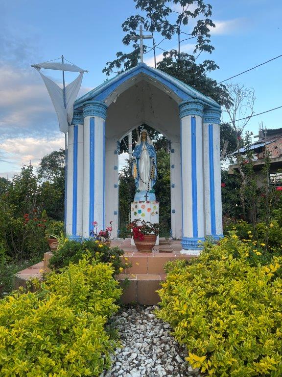 I’d prebooked a room in the Hotel La Gaitana Heroina Indigena ($20AUD) in San Agustin because it was an easy name to say when people asked me where I was staying. Not. I’d been on the bike for about seven hours and was ready to get off it. The place was nice. Small room. Good parking. Nice people. It looked just like the photo which helped find it. I had a late lunch around the corner at a little restaurant and turns out the owners son was studying in Brisbane and so I had a long spanish lesson with my lunch. I had a look around town which had the usual, town square with a church and a town sign but I also discovered another church with a bit of a weird statue out the front. I’m not sure if the big guy would have given approval for that one. I also climbed a hill to say hi to Mary.