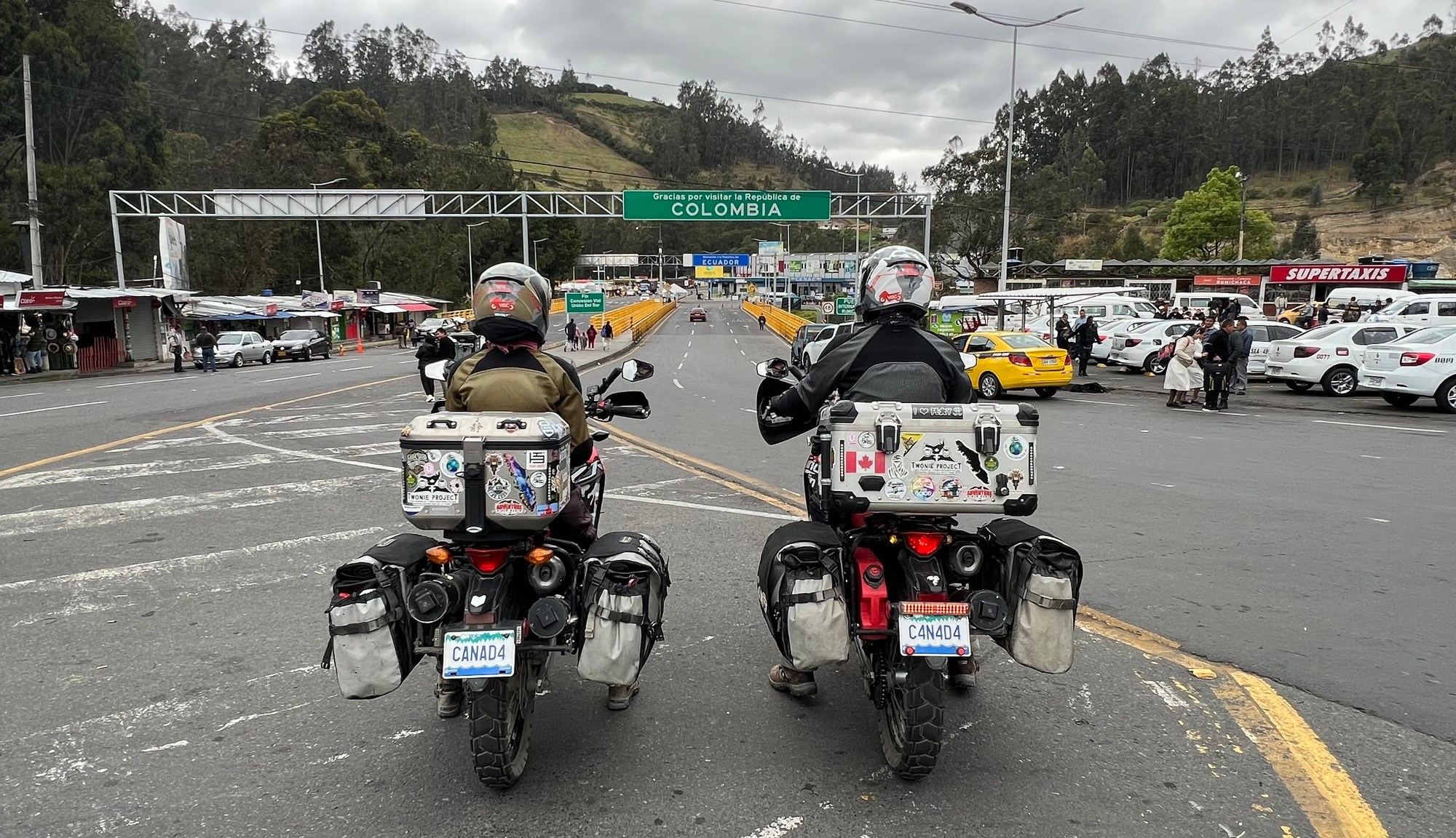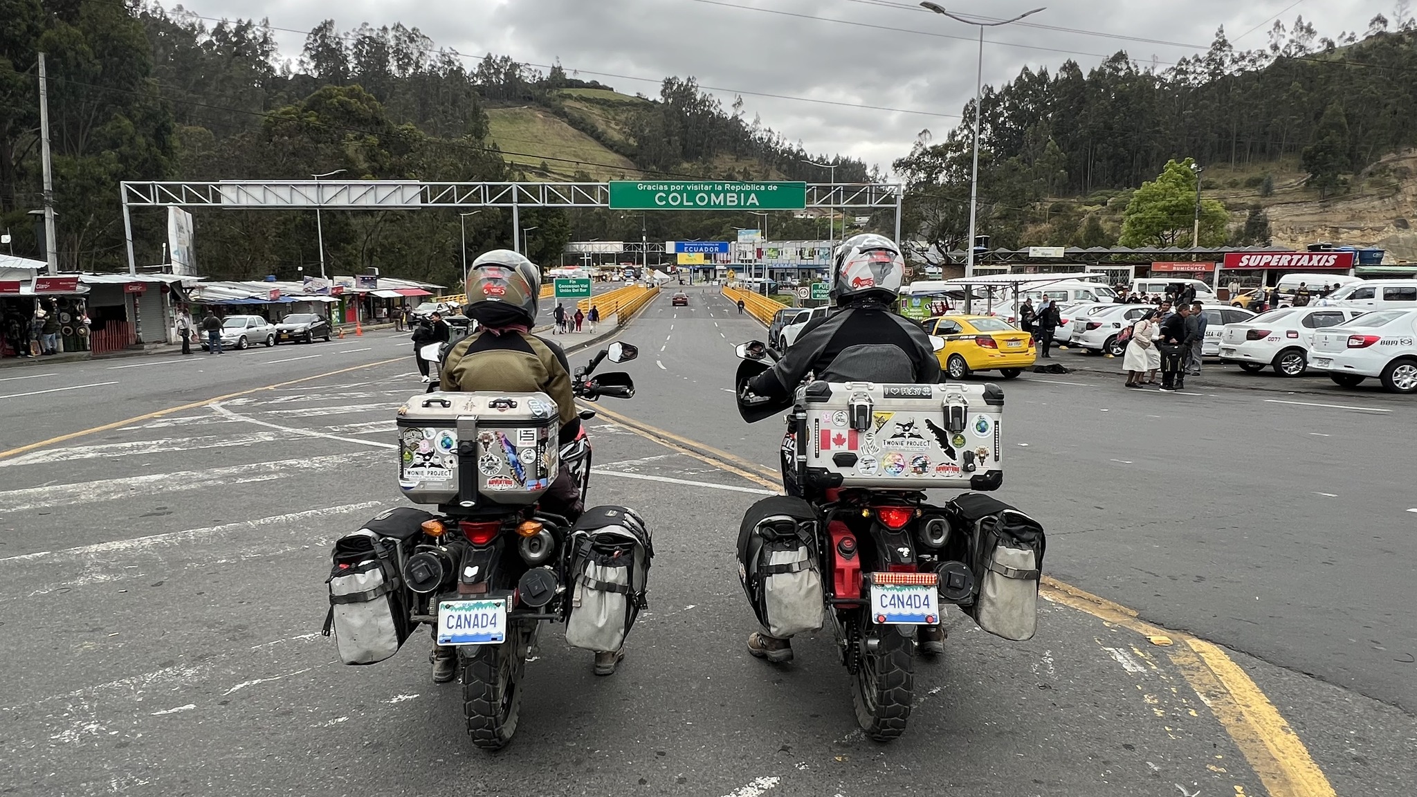 The border was swarming with money changers happy to exchange your excess pesos for $US which is the currency of Ecuador. The Ecuador border is very close to the Colombian one and you could have easily have driven through but that would just cause problems latter on. But I did consider it. And it wasn’t off the cards. I stole a photo of the border off the Canadians.