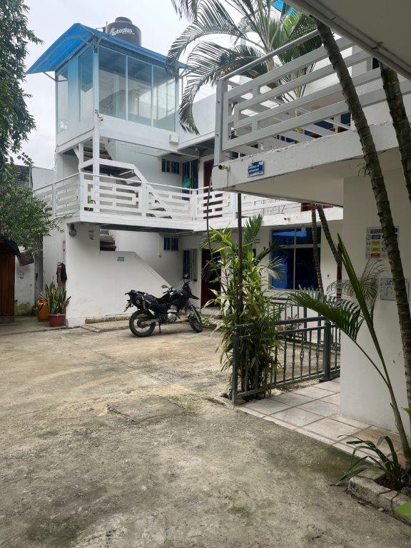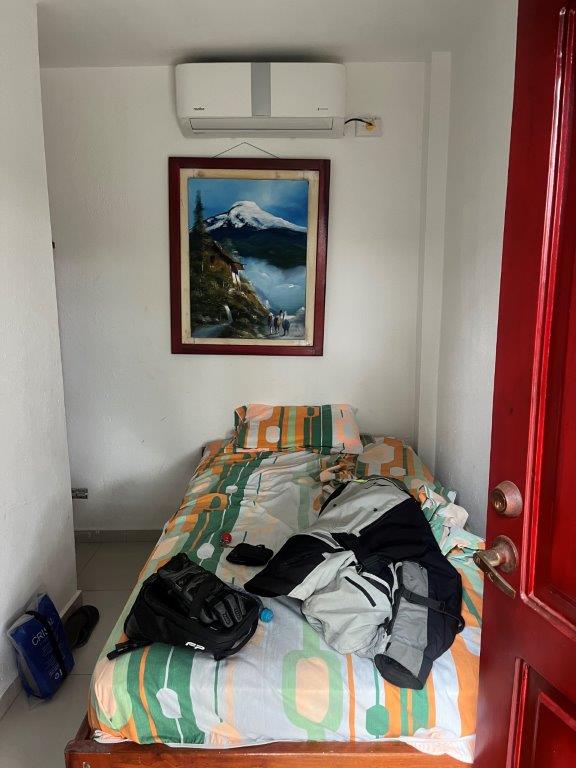I went to a hotel that was listed on booking dot com and had to park on the busy footpath while I tried to locate it. No one I asked knew where it was. I googled again and found a picture and I was parked right out the front. No signage and a tiny little door between two shops. I knocked on the door and a guy came out. Not overly enthusiastic about my arrival. He had a room but I would have to park the bike at a parqadero down the street. I rode down the footpath for a look and that seemed as equally dodgy and expensive. I decided to try the next hostal on the list. The Hostal Montesa. The lady was nice. She had a room for $22AUD or another for $30AUD and it came with free safe parking in the hotel. It was cheaper than the first place, even without the parking, so I took the bigger more expensive room with the street view.