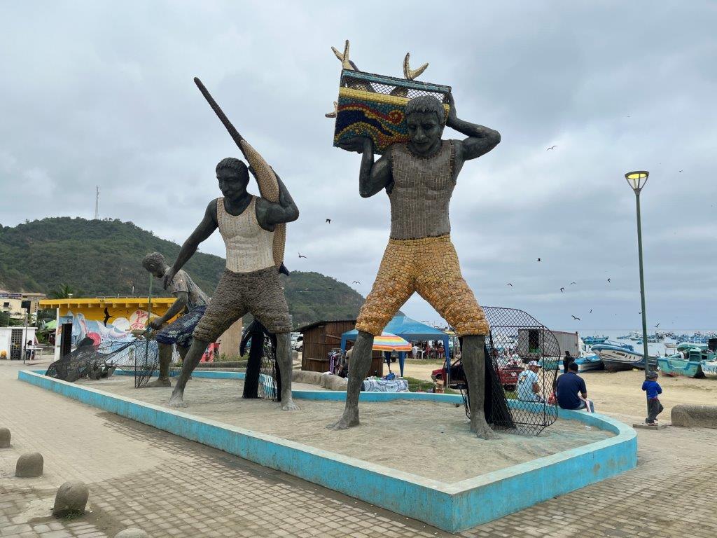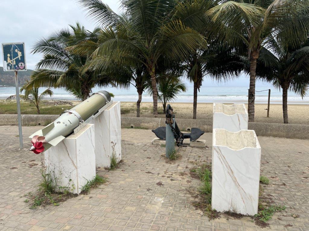 Next day was overcast again. The fish market was bustling and an interesting place to walk around. The bay was full what seemed like hundreds of similar boats bringing in fish of all sorts. It was a real hive of activity. There were people buying and selling and cooking and walking around. There was a woman selling little bird eggs. She had some cooked and ready to go and the others were just stacked in her cart. The town had a huge Malecon (boardwalk) and so I wandered up to one end of it and found a few weird things. No people but I guess it’s not beach weather. The strangest was a couple of missiles and an anchor. And one of the missiles was missing?