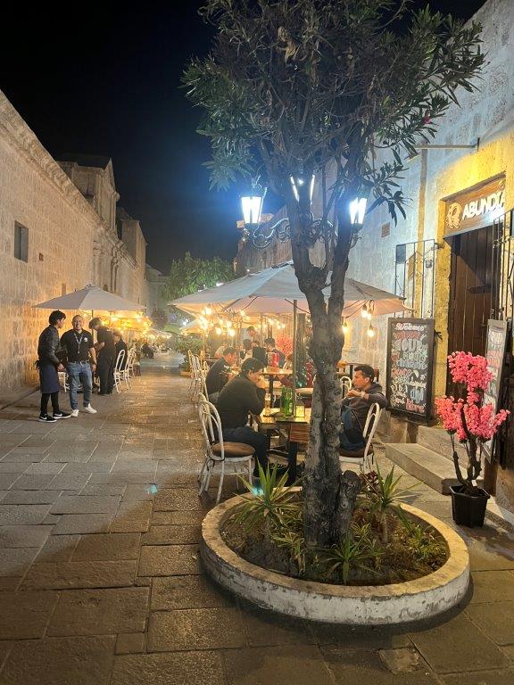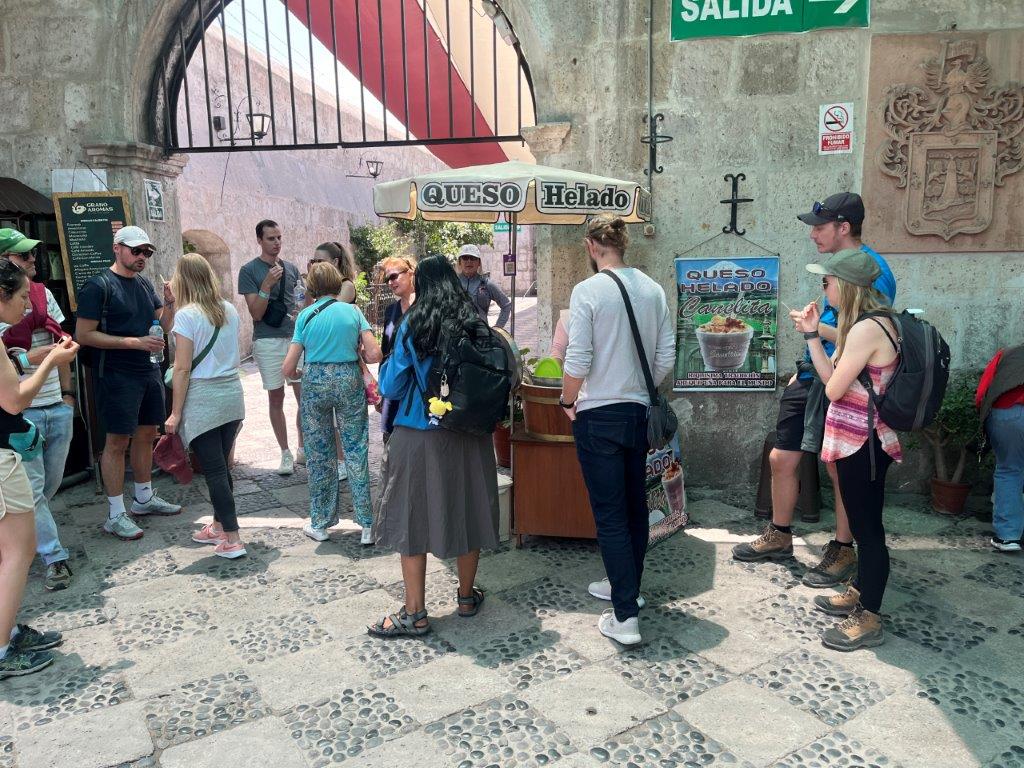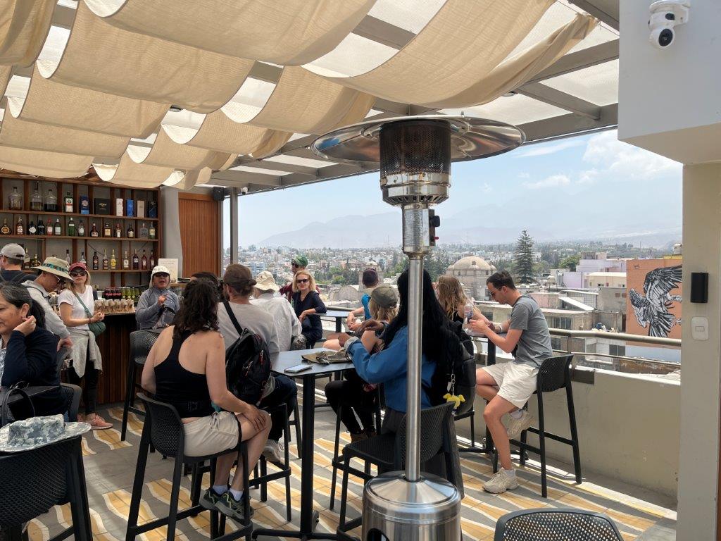I’m getting to the end of the blog and haven’t even mentioned what the city is like. It’s beautiful. Lots and lots of beautiful old stone buildings. Great weather. It doesn’t rain much. Lots of sun but not hot. It’s known as the white city because the buildings are made from blocks of white volcanic stone called sillar. The architecture is a mainly colonial but with a bit of local trim and lots of local colour from the indigenous inhabitants. Lots of narrow streets and plazas. There are just over a million people live in Arequipa. There are also three big snow capped volcanos surrounding the city which adds to its beauty. And by the way it’s pronounced ‘r-e-KEE-pa’ in Australian. It now ranks in the Top 10 of my favourite cities in the world. I also did a city tour which was a bit poor to be honest. Tasted more chocolate, some cheese ice cream and had a nice roof top bar view. The guide spoke heavily accented english and really fast. I met a couple of people. One was a guy who was 83 years old.