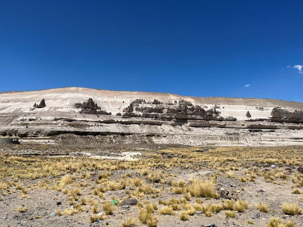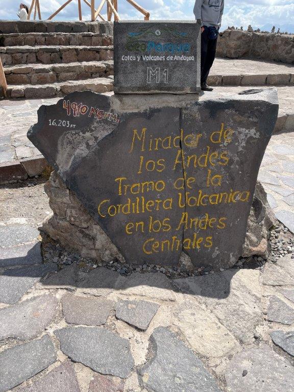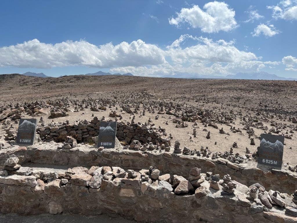 As the road continued up it was getting cold and I thought I would need to stop and put on extra clothes but then I was suddenly at a summit. With signs and stalls and people. It is called The Mirador de los Andes and is 4910m (16203ft) and is a section of the volcanic mountain range in the central Andes, just in case you can’t read the rock. I left my bike running as I didn’t want it to cool down and I went up on the platform and snapped a couple of pics and laughed at all the little rock towers. There were lots of high peaks around but they didn’t look overly high when you are already at 4900m.