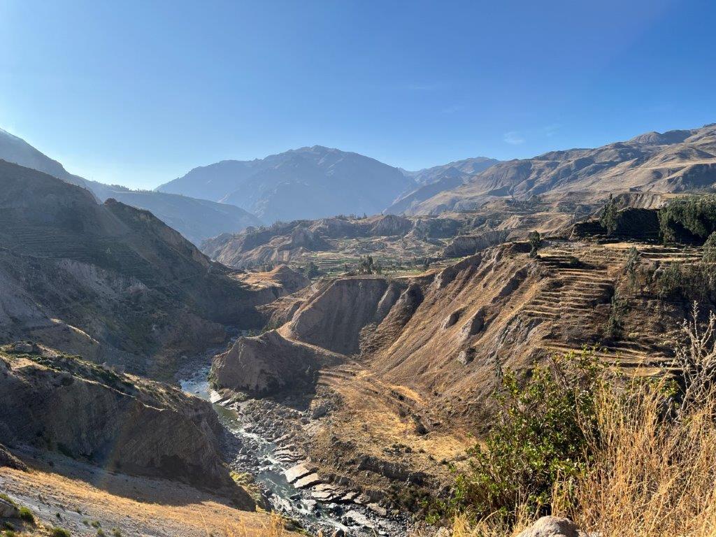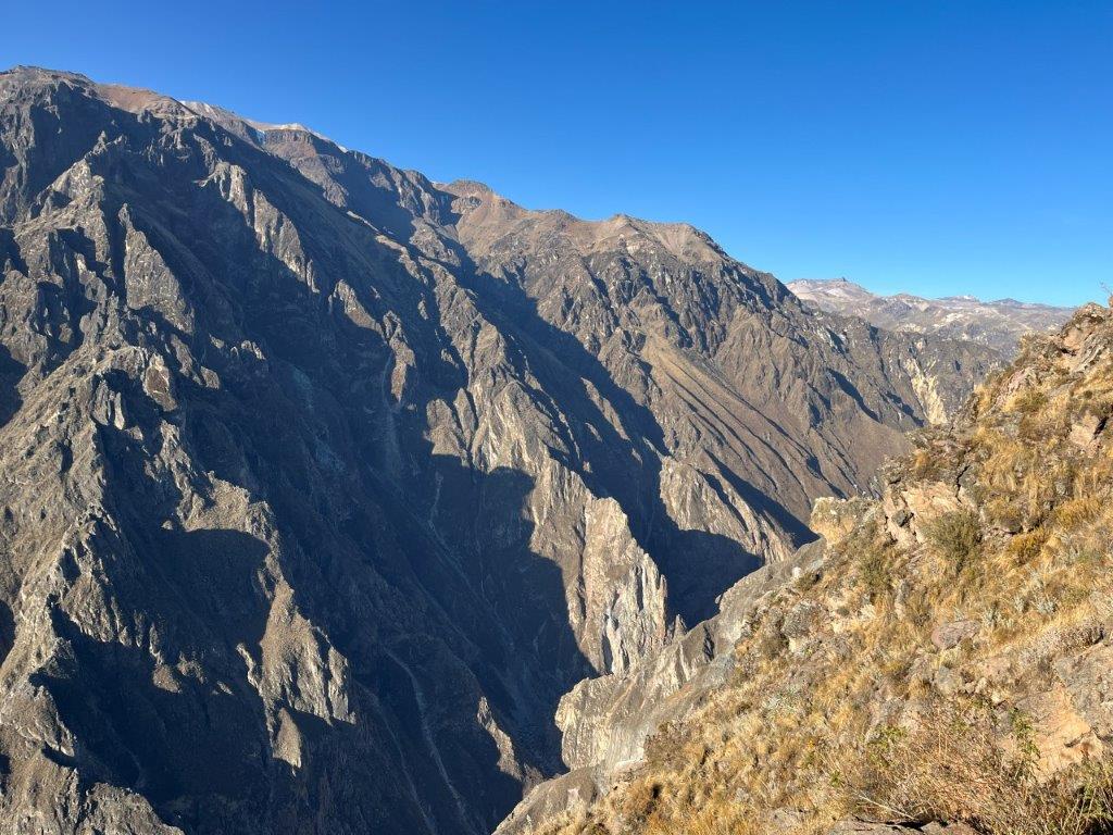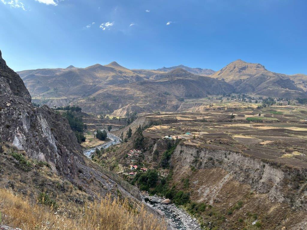 My fingers were cold and so I was happy to get back on the bike and head down the other side. The drop was pretty rapid, and it wasn’t long before I could see the town of Chivay down below. Chivay is the gateway town to the Colca Canyon. Maybe not quite world famous yet but at least now about another 50 people have heard of it. And so you should. Its one of the deepest canyons in the world and at 3,270 meters (10,735 feet) it is about twice as deep as the Grand Canyon in the USA.
