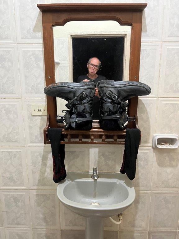 The hotel was on the edge of town and over it’s back fence was Brazil. They weren’t expecting visitors. The lady was nice and checked a few rooms to see if they had power and when she found one she offered it to me. No towel, no toilet paper, no internet but a room with a light globe and an airconditioner. It was a bit depressing, but I was tired and hungry but also thankful for the food I’d had last night and for the big breakfast before I left. I did my best to try and hang my stuff so it could dry. I tipped over a cup of muddy water out of both my riding boots. I didn’t want to use the shower so I just put on some dry clothes and my thongs and wandered back in to town and found some food. When I returned the lady had a Brazilian friend visiting and she was really nice and was living in the town. She knew the immigration person and chased him up for me on her phone and said he would be around town tomorrow. No other details. I also had another problem. I didn’t know if I had used up more fuel with the bad road and wheel spinning in the mud. If I continued on next day, I didn’t want to end up running out of fuel on the dangerous section of road.