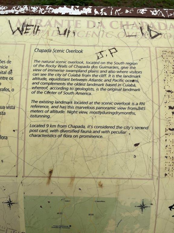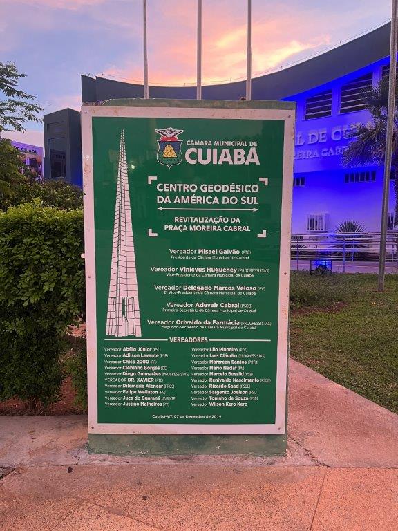 Cuiaba is a large rural city with a population of a million people. It was started in the 1700’s when it was just jungle, and the Portuguese came in search of gold. My attraction was not gold but the fact that the city is said to be the geographical centre of South America. Near the downtown area and next to some government building they have a 20m obelisk that was built in 1975. It is over the top of a stone marker that was put there by a famous surveyor in 1908. There isn’t a sign about the centre itself but there is a lovely new sign about all the people involved in putting up a sign about the people involved with the new sign. And there is probably good reason for that. Because.