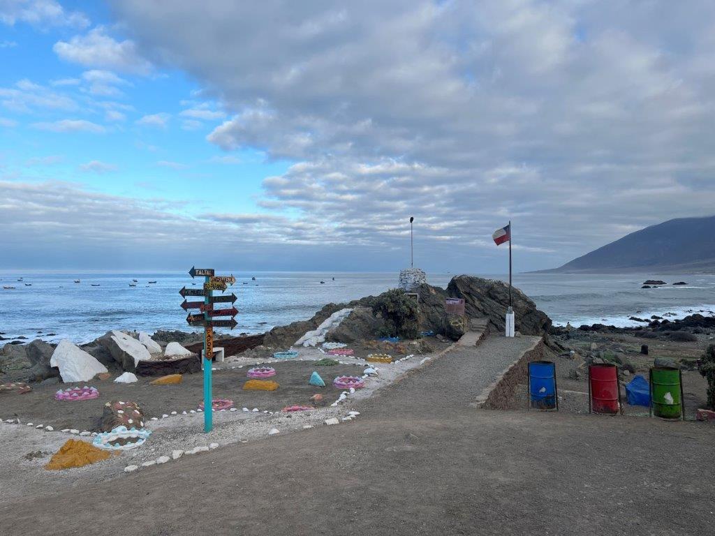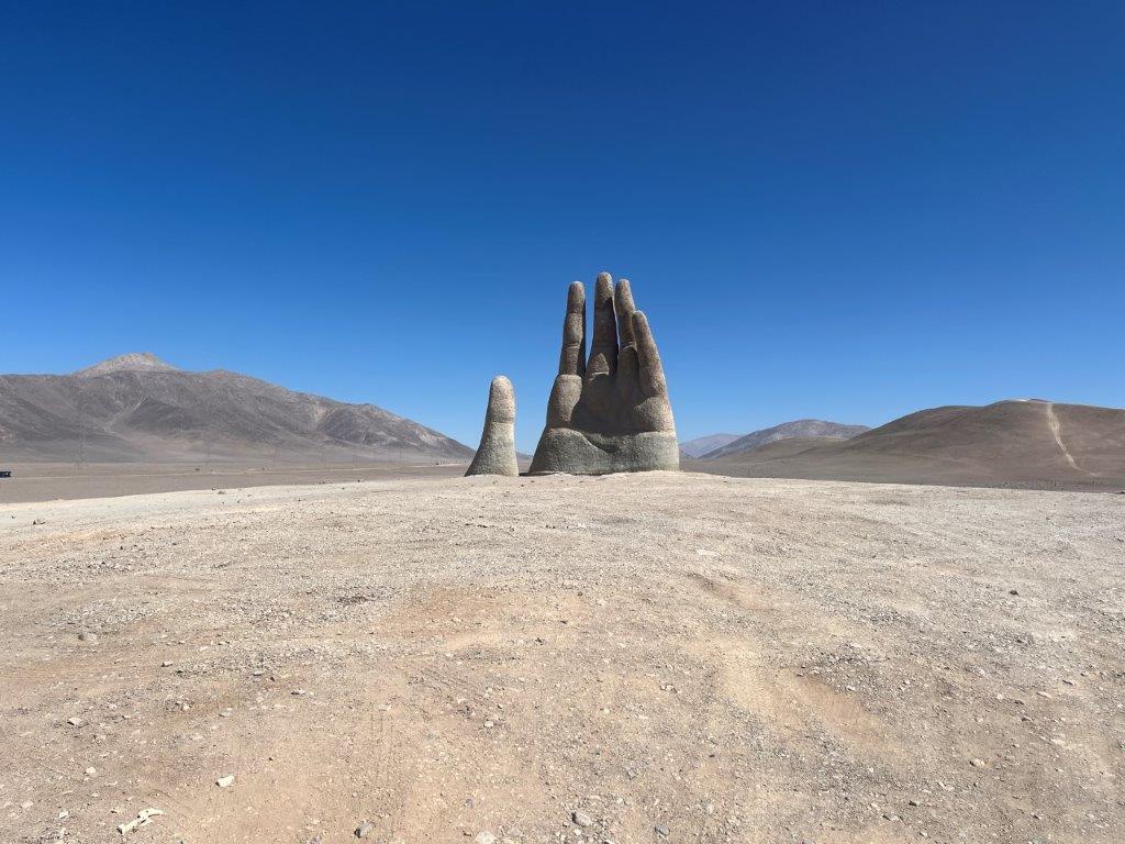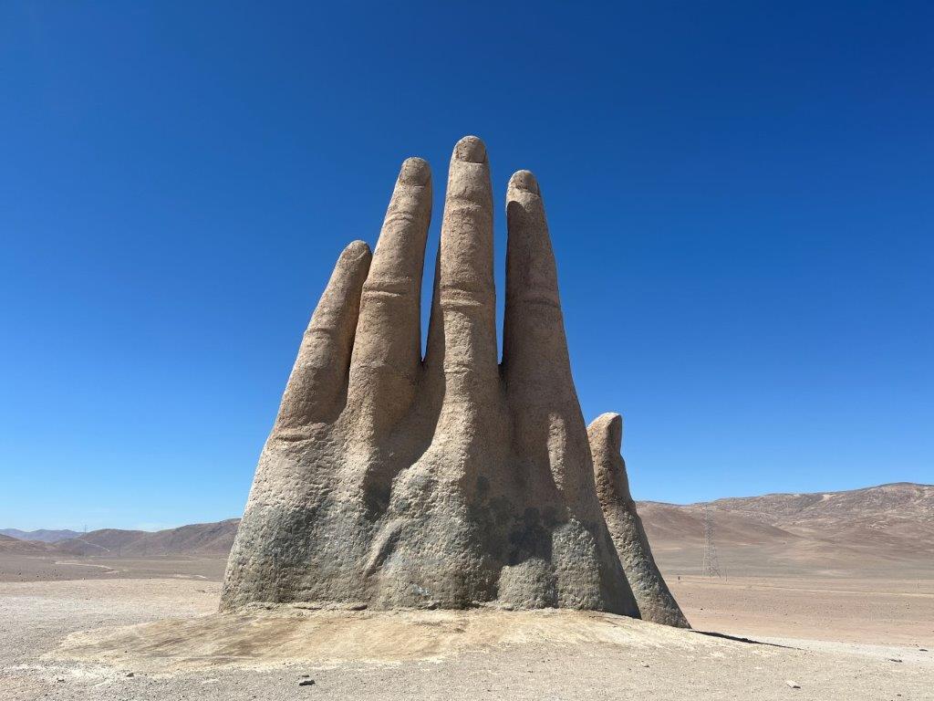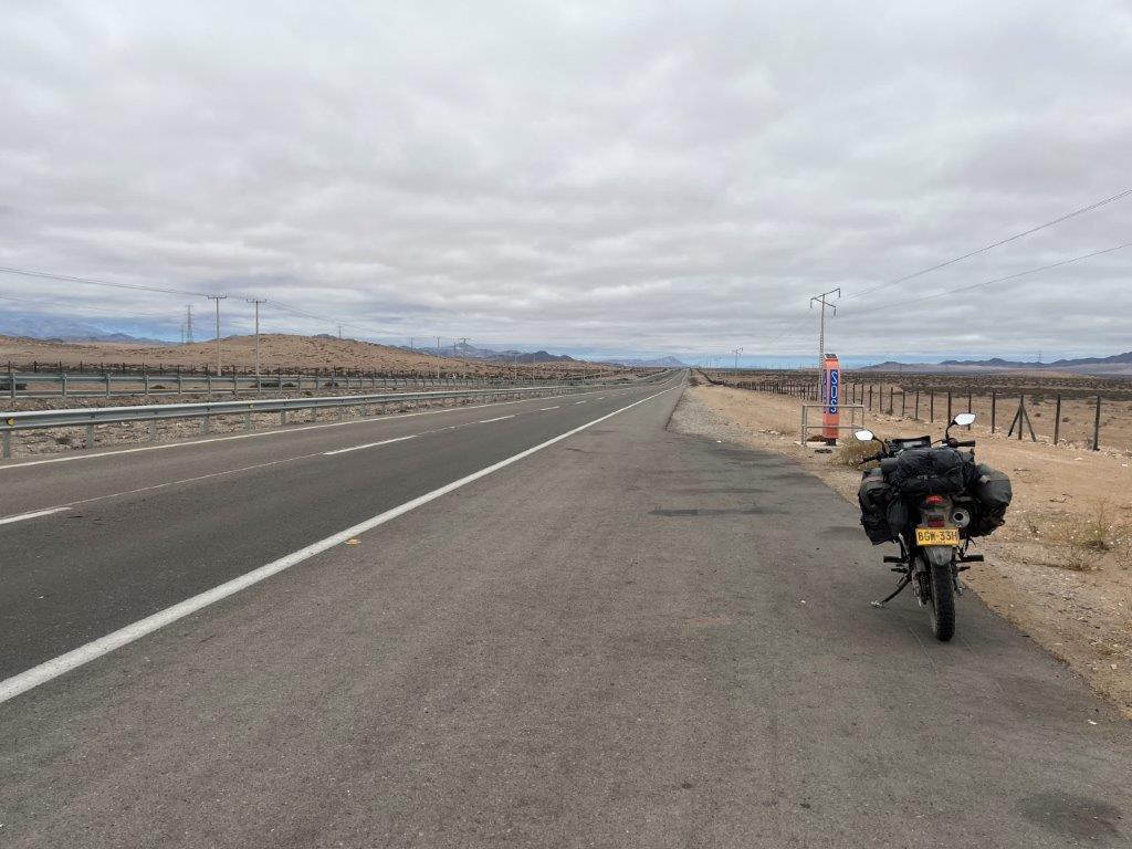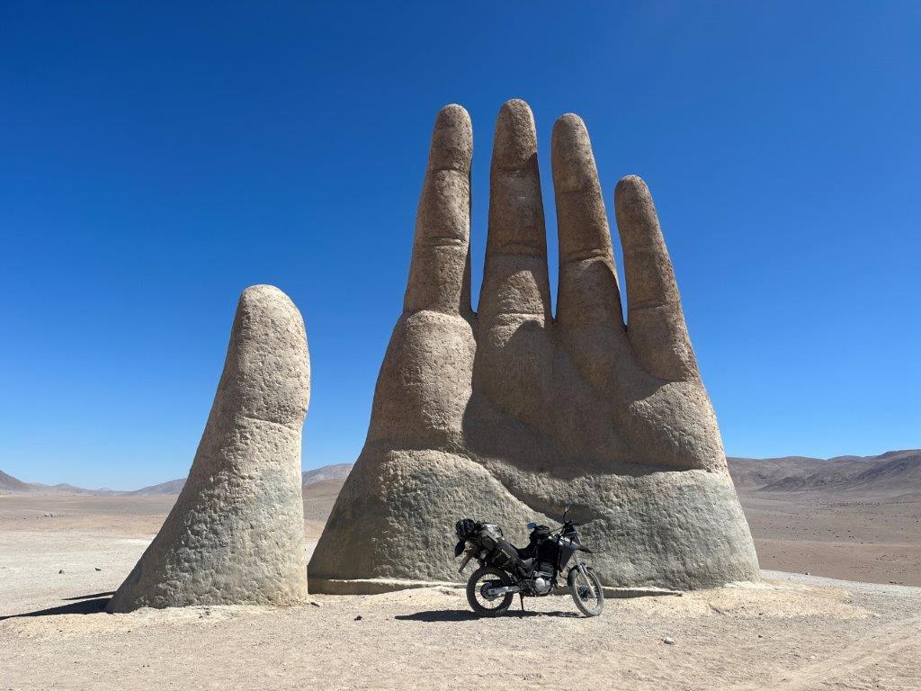 I made a plan to head south from Antofagasta to Santiago (1350kms) as it was not helping me mentally just hanging around in my nice hotel. I decided to try and do 200kms a day with lots of breaks off the bike. I had my last physio appointment at 1:00pm in Antofagasta and then headed off to the “Hand in the Desert” (La Mano del Desierto) which you may recognise and was created by the Chilean sculptor Mario Irarrázabal in 1992. It’s in the middle of nowhere in the Atacama Desert and only a 15km detour in the direction I was heading. And about an hour’s ride. It was another must see thing on my list.
