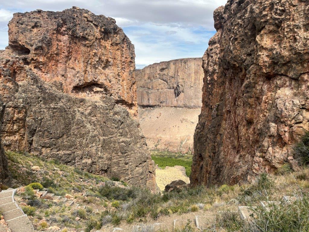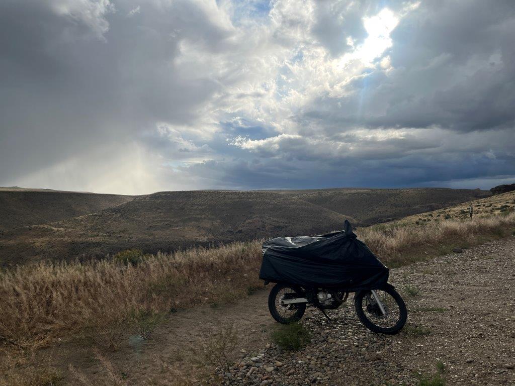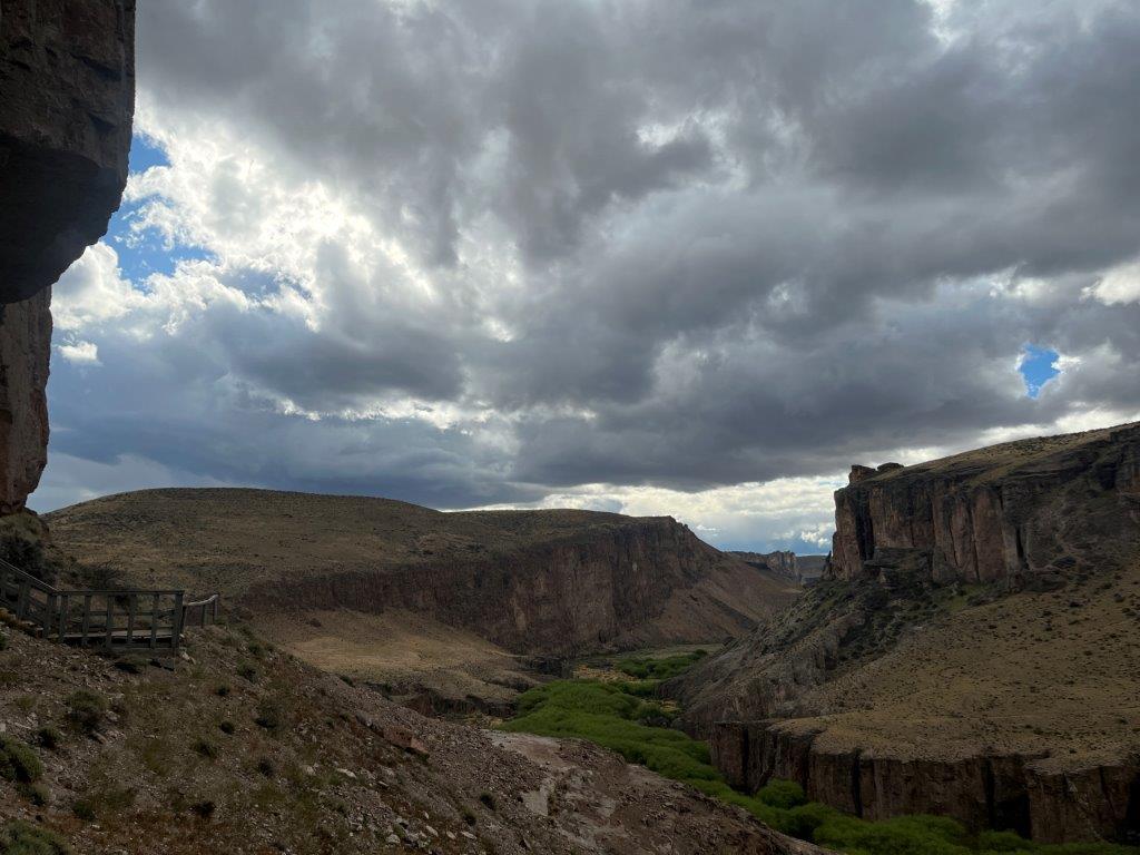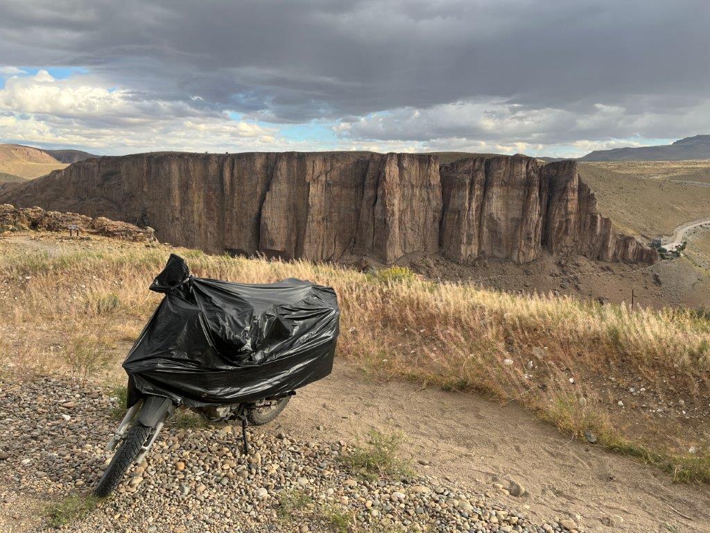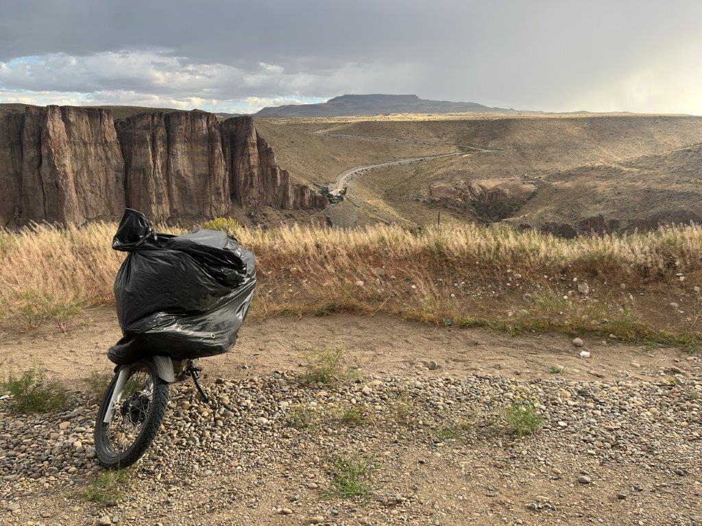 We got to the end of the walkway and then I slipped away and back to the start because I needed to walk the 3kms back to my bike if it hadn’t blown away. And the skies were getting even darker. I made it back in time and then had to redress for the 5km ride and also because it was easier to wear everything than try and carry it. I could see across the canyon, and having been there, could see the ticket office and the road which you can go on that takes you all the way there without having to walk. It’s called the main entrance. But it would have been a lot more riding and less exercise to go that way. As I pulled up at the rangers office five kms away it started to bucket down. The have a little shop there and a small campground. It’s run by a group of young rangers who spend the season living there. They make cakes and empanadas and they sell beer, coke, and water. I was fine. It rained for a couple of hours and it was obvious that I wasn’t going back to the main road and back to a nice dry hotel. Fortunately, I had all my camping gear for this exact situation.