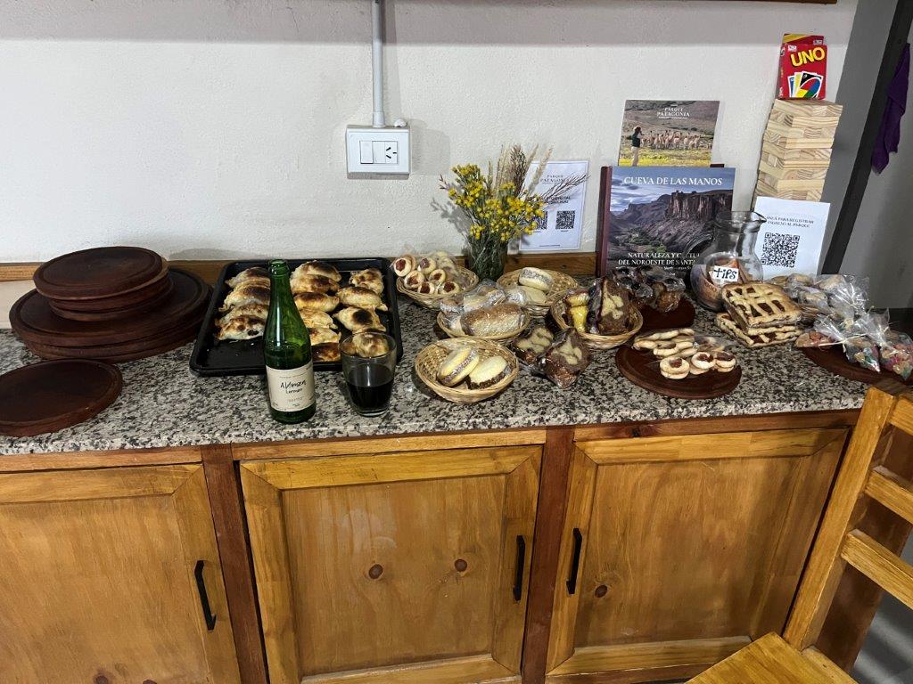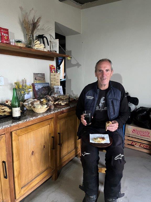Because of the road to the south being gravel and all the rain I had to head back north to Perito Moreno. A bit of rain helped wash some of the dirt off me and the bike. The only hotel I could find was the Americano Hotel ($80AUD). I was tired. And it was across the road from the Tazmania bakery? Funnily enough when I parked my bike in the garage I saw the bikes of the two American guys I’d met the previous day. We caught up for dinner. I just had a beer as I was full of empanadas and cake. They had also tried to go to the cave of hands, but the road was closed. Even the main road. Actually the entire park was closed for a couple of days until things dried out. They were happy to hear firsthand that the roads were really bad and glad not be on them with their big heavy bikes. Next morning we had an early dismal breakfast together and then they headed off on the long sealed route over to Ruta 3 and on to Ushuaia. I needed to do a couple of things first before following them. I was also a bit slow as my body was aching from my 20km motocross ordeal. It was a nice pain though. Equal on both arms and both legs.