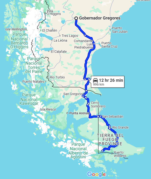 I made it okay and found a place called Hostal Aldo ($50AUD) which had a few other bikers staying there. I struggled to find somewhere nice to eat and so it was empanadas and beer for dinner. Next day I took the 288 across to the 3 and then down to the border with Chile. Not much to see in this flat part of Patagonia. Lots of wind but you can’t see that either. But you can feel it. I made it to the border and decided to go through so I had a good start to the next day. To get to Ushuaia you need to cross back into Chile for a bit and then catch a ferry to Tierra del Fuego and then cross back into Argentina again to go the rest of the way. The border was fine and a found a little town with dirt roads and a nice warm little family run place to stay called the Hostal San Gregorio. Named after the town. It was starting to get colder as I was moving south quickly. 520kms today.