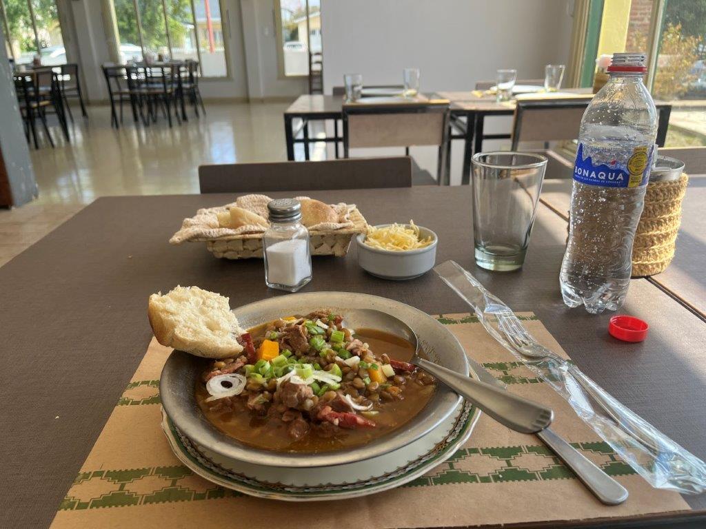 The next day the weather was looking really crap. And during the night. Winds around 80kph and stronger gusts. The town was on yellow alert? Checkout was at 10:00am but there was a nice area to hang out away from the wind. I was hoping to leave about 1:00pm but the owner said it would last all day and suggested I stay another night. He said a German woman had left his place a few weeks ago on a bike and the wind blew her into a truck and she lost her leg. That was sobering. I said I wouldn’t be leaving until the winds were at least 50kph or below. I asked about a restaurant that might be open and he gave me a good recommendation for the El Silencio Parilla y Bodegon Rural restaurant. It was in town and I rode my bike there. I was the only person but it was great and I had a delicious healthy soup and a lovely chat with the owner. Filled a couple of hours of my wait.