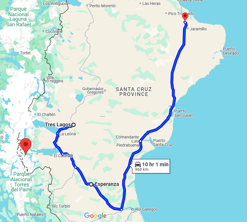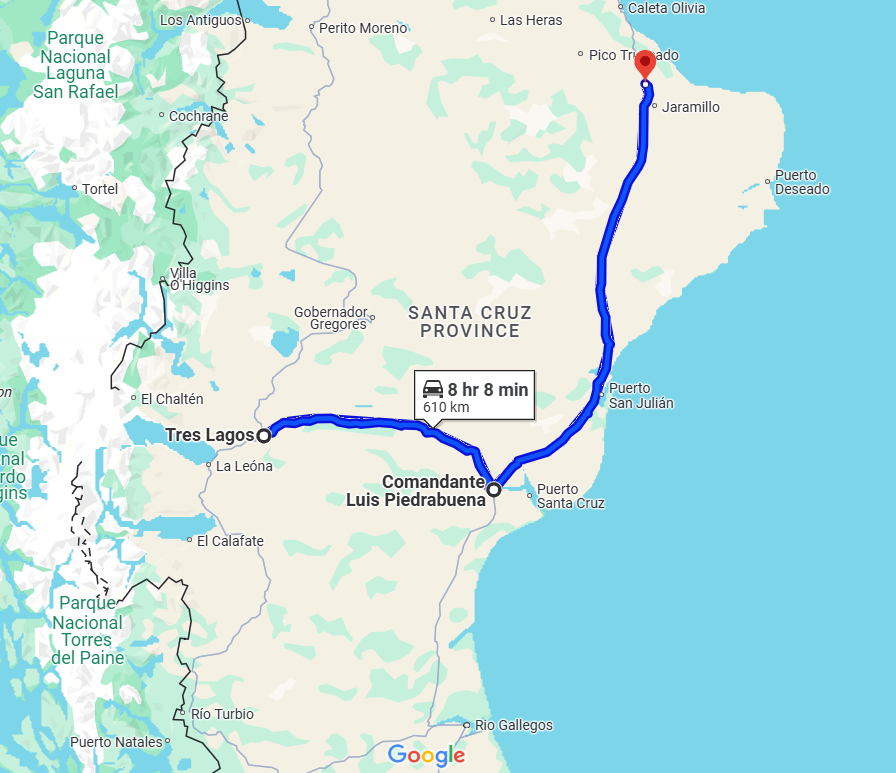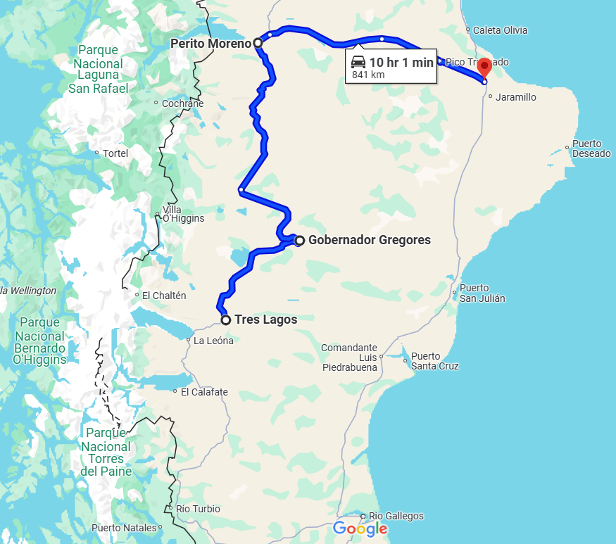 And this is where my story in Tres Lagos starts. I wanted to get from Chile back over to the east coast and up to Buenos Aires. There are really only 3 sealed road options that join Ruta 40 with Ruta 3. One, to the north, Ruta 43, and is the one that the older American guys on the big bikes took (in my blog a few weeks ago). Two, Ruta 27 and Ruta 288, is the one I took on my way down, from Gobernador Gregores to Comandante Luis Piedrabuena. Try saying that fast. And three, is Ruta 5 which joins the Ruta 3 near Rio Gallegos which is way back down near Tierra del Fuego. I’m explaining all this in detail because working these routes out is a big part of my trip. All the maps below have the same start and finish points.