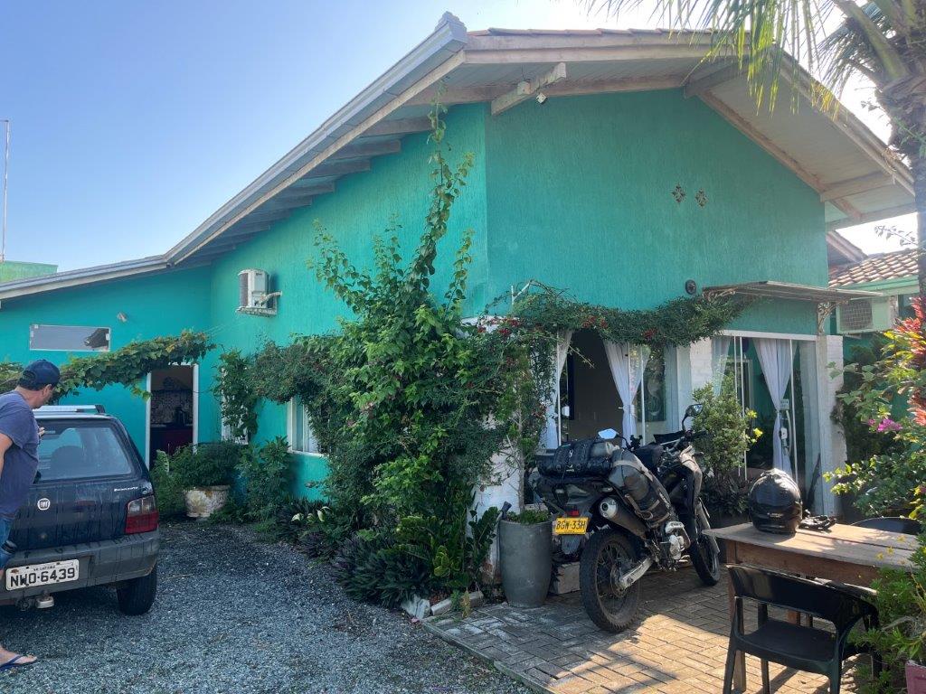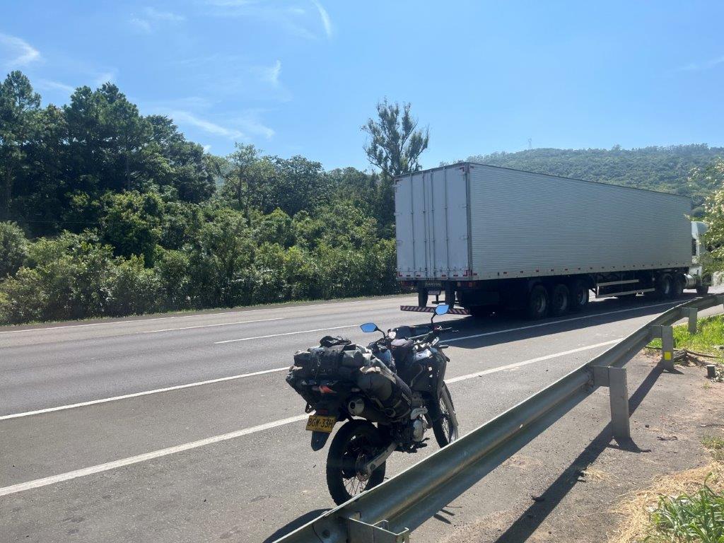 Next day after a weird exit where I just sat in front of a camera until the gate magically opened, I rode north along the coast so I could look at more farmland and huge small cities full of apartment blocks and construction. I rode into Florianopolis because it a weird little appendage on the coast of Brazil with a weird name, so it just seemed appropriate to ride in. I had thought I might stay there the night but after crossing the big bridge and going through the tunnel I thought I’d seen enough and so I just retraced my route back to the main rode and rode another 130kms until it was starting to get dark. I picked a roadside hotel but it seemed locked and no one was answering the bell. Another guy in a tiny car was also trying to check in. There was another guy sitting out the back drinking a beer. He spoke to the other potential client with lots of pointing and I assume directions and then he nodded and then he signalled me to follow him in his tiny car. Then it started to get strange.