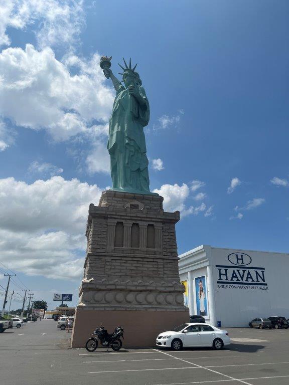 I assumed we’d just head down the road but we went for miles. Through little towns where the guy would slow down and ask directions and continue on. It went on for about 15 minutes. I was intrigued and it was dark so I just kept following. We then drove up the wrong way on a small street and stopped outside a little place called Gengibre Hospederia. The guy let me check in first with my translator app and then he checked in. Turned out to be a beautiful little B&B ($50AUD) with a great breakfast and lovely host. We had a nice chat using my phone. She suggested a great little restaurant by the beach in a lovely spot where I had a really nice meal and a beer for $14AUD. There was this loud (visually and musically) that was cruising the streets and picking up partygoers. Next morning I ate the lovely breakfast that I didn’t need and headed off to Sao Paulo. On the way I saw a couple of these stores that had a huge Statue of Liberty out the front. You can see my bike in the first picture. I discovered that it’s free WiFi in the carpark near the statue. Sao Paulo is the biggest city in Brazil and the one where everybody said not to go.