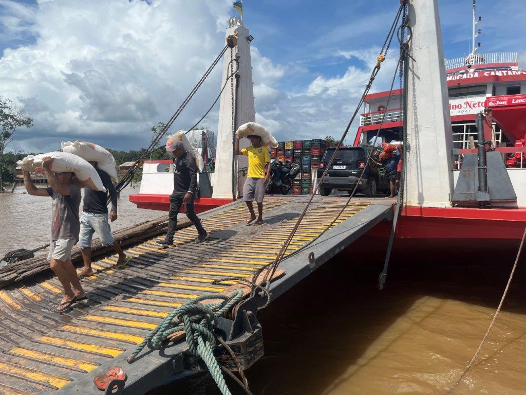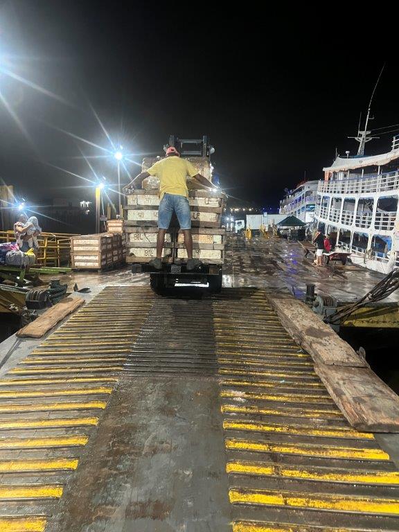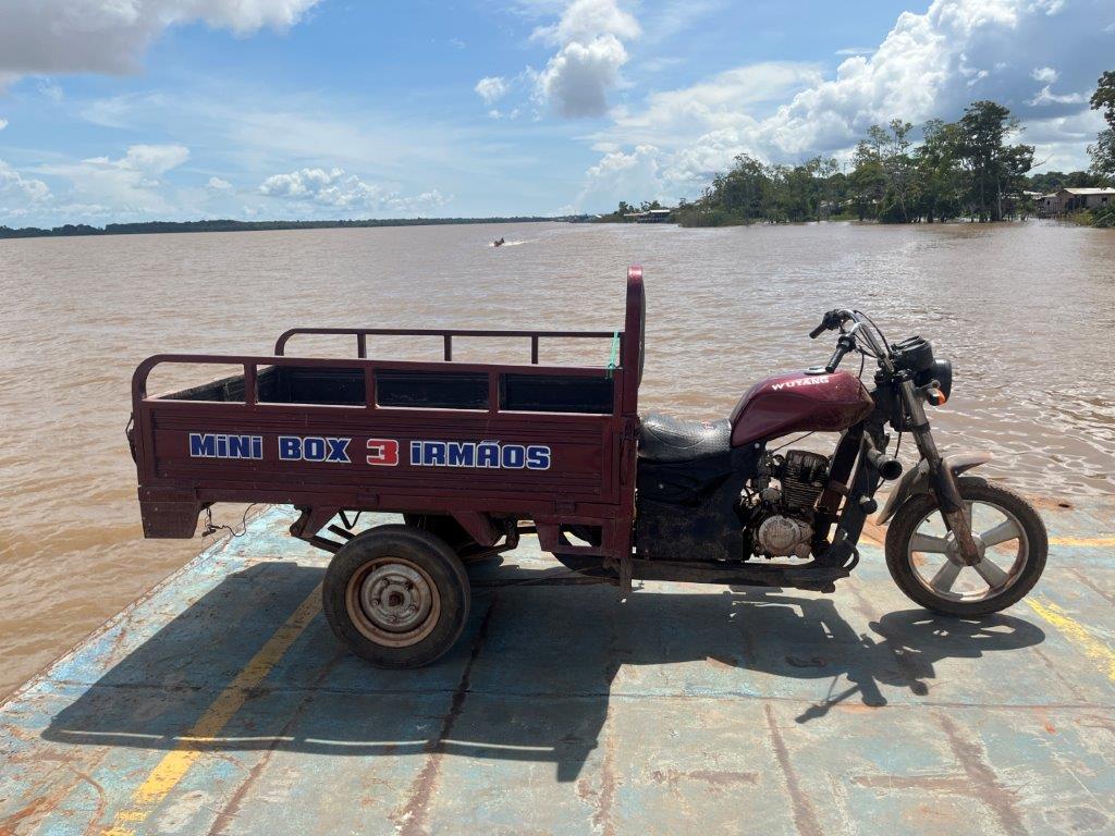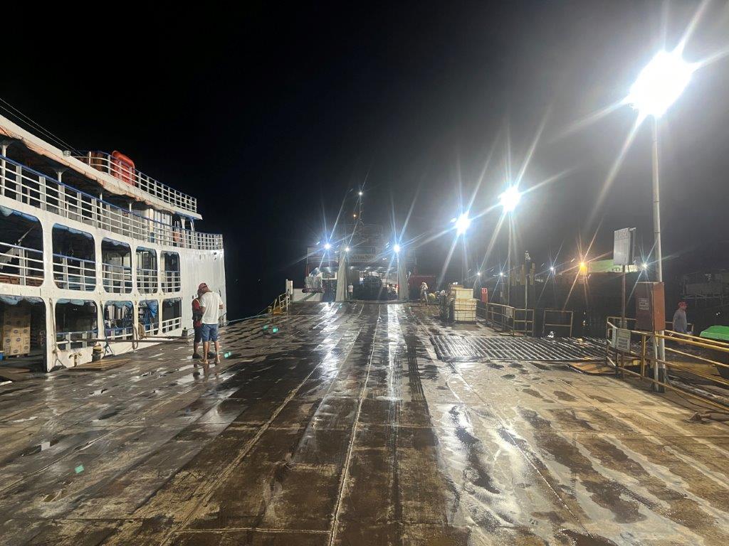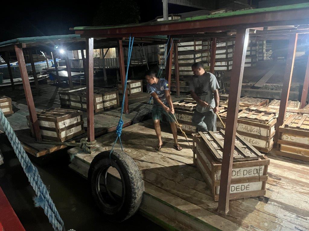 About 4:00am on the second night the engines died down and I saw lights and so knew we were in a place with electricity. We had arrived in Macapa about 4 hours early. I think that it is probably a common thing. Some people just stayed in their hammocks. Others slowly packed up. I went down onto the main deck and the guys were starting to offload the fish crates. All manually onto carts with big wheels. Then a truck arrived and started taking limes as I was packing up my bike.