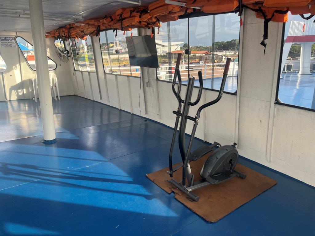 I’m sure I was the only tourist on the boat. And the only white guy. And the only person who spoke English. But I was cool with that. The ferry had everything I needed. Toilet/shower combos. A bar and a little snack shop. A gym. Ha. A little restaurant that opened for 3 meals a day. I had evening meals both nights. First night fish. Second night meat. Both times with rice, beans, spaghetti, and a sort of salad. All crammed in a styrofoam container and eaten with plastic cutlery at two small communal tables. And a bargain at about eight bucks.