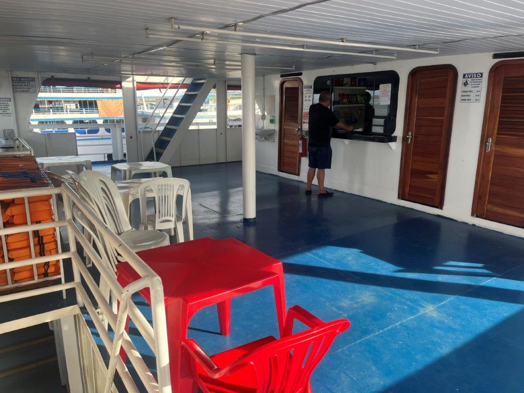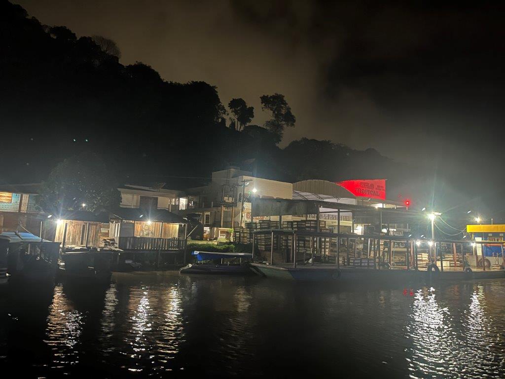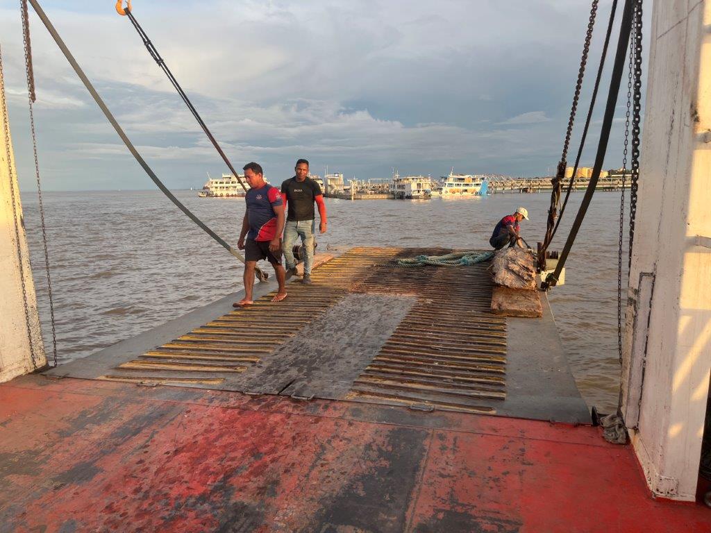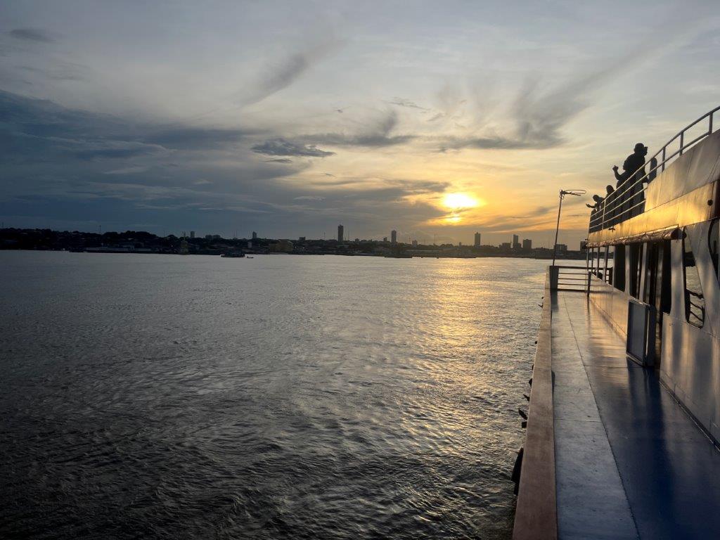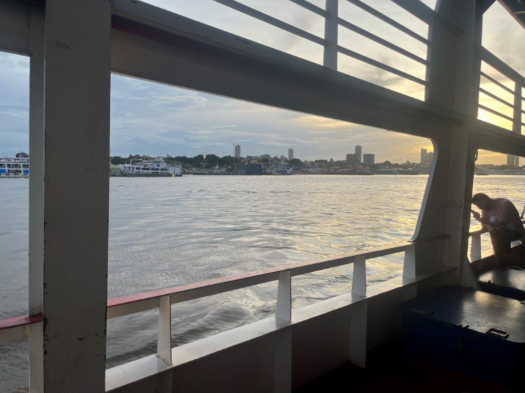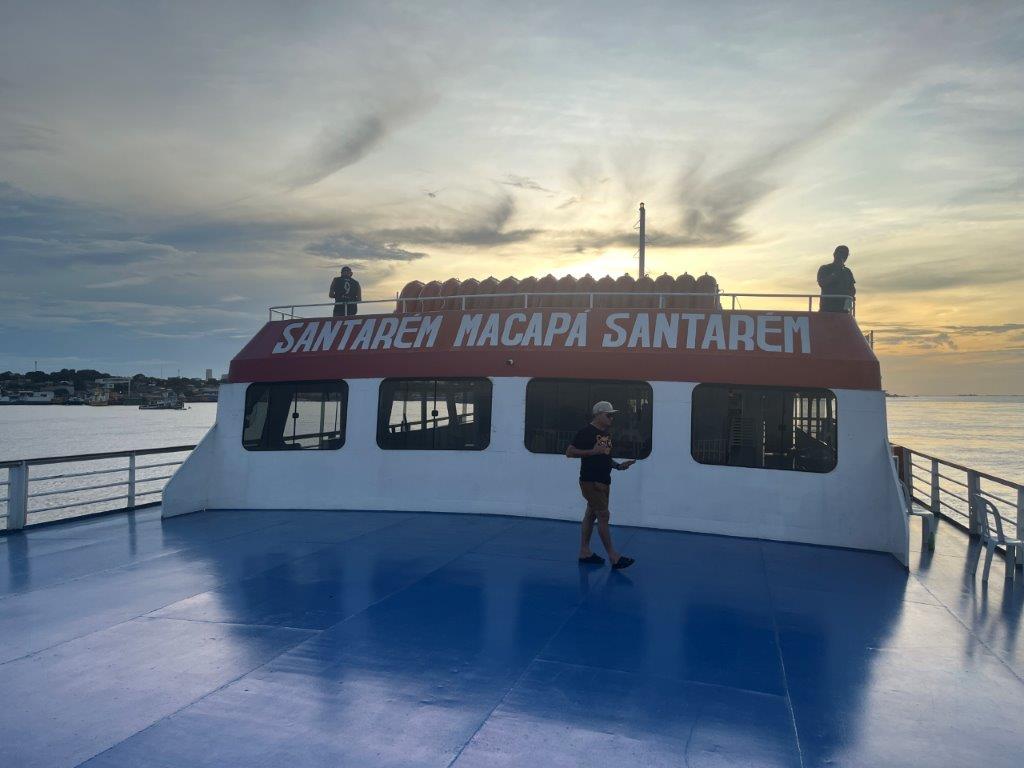 Then the loader helped take some of the weight off the ferry’s loading ramp as they manually hauled the chains to raise it, and we were off. 15 minutes behind schedule. I’d call it on time. Just on sunset. I grabbed a beer from the bar and watched Santarem light up as the darkness arrived. I also watched as we crossed the line in the water from the Tapajos River into the Amazon River. Seamless. Not even a bump. It was pretty cool to be on a ferry, on the Amazon and sailing off into the darkness.