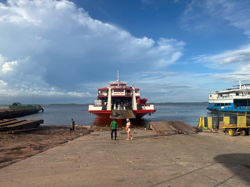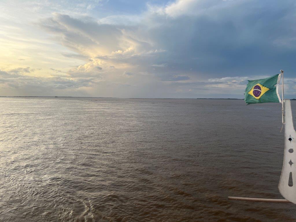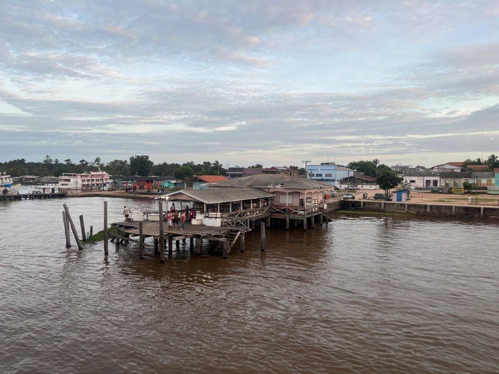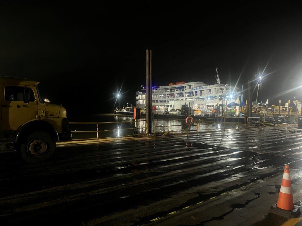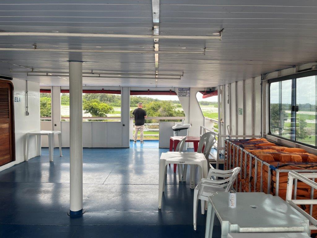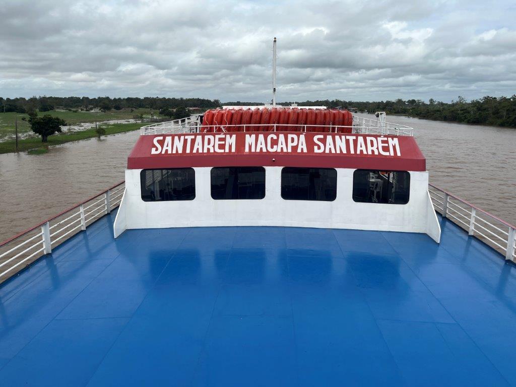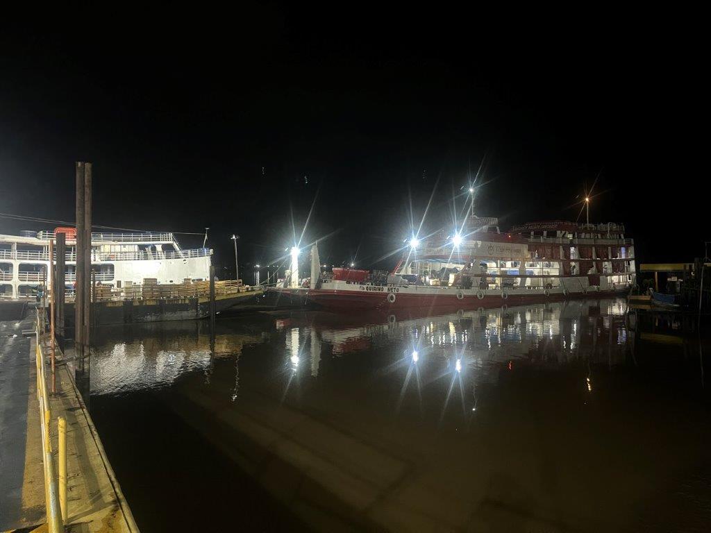 Then the loader helped take some of the weight off the ferry’s loading ramp as they manually hauled the chains to raise it, and we were off. 15 minutes behind schedule. I’d call it on time. Just on sunset. I grabbed a beer from the bar and watched Santarem light up as the darkness arrived. I also watched as we crossed the line in the water from the Tapajos River into the Amazon River. Seamless. Not even a bump. It was pretty cool to be on a ferry, on the Amazon and sailing off into the darkness.