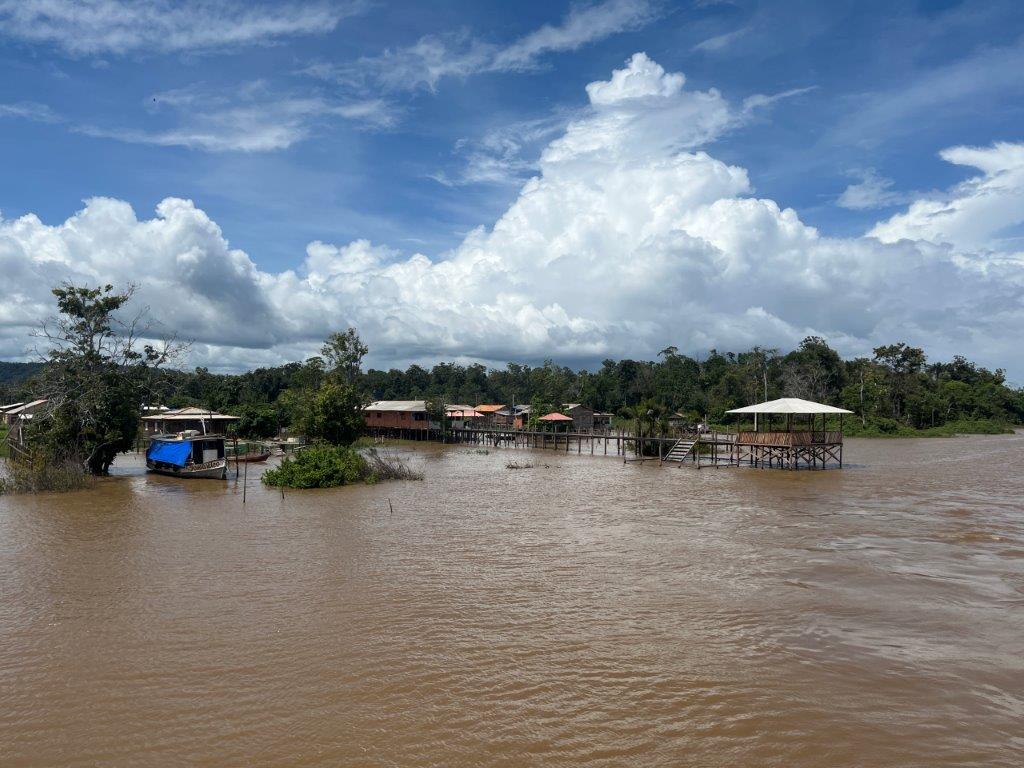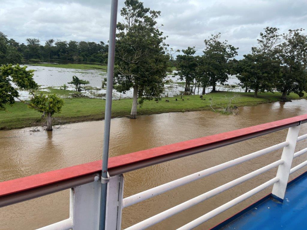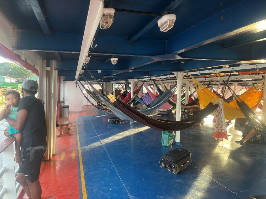 There were two sleeping decks and numbered places for over 300 hammocks but fortunately only about 70 passengers, so we were well spaced out. I grabbed an edge location so I could lie in my hammock and watch the world go by. Despite motoring downstream, we had the engine running and it was a pretty consistent noise, although by the end of the trip I didn’t notice it anymore. When I did notice it was during the night when it backed off. And so I would get up to see why. It was mainly because we pulled up to jetties at little villages to do people or supplies transfers. Sometimes just for a few minutes. Other times for an hour or so.