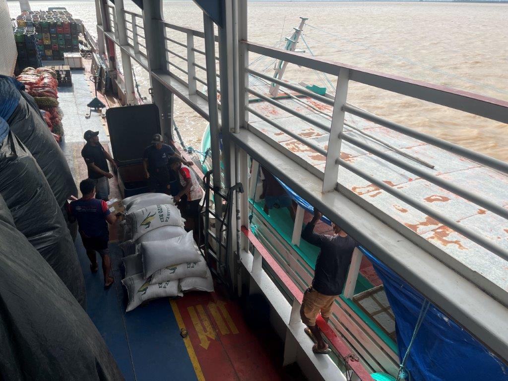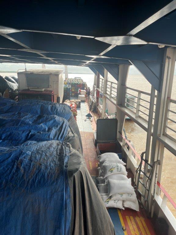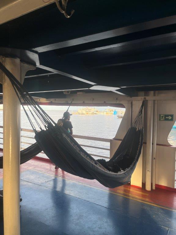 Sleeping in a hammock works better after too many beers and I didn’t want to do that, but I did manage to get a few hours in here and there. I didn’t really talk to anyone for the trip. Now that I think about it no one talked much to anyone. It was all peaceful. Except when they cranked up the speaker at the bar. Fortunately that didn’t happen much. There was only a couple of people on the ferry that drank a beer. Lots of locals going to the big smoke or returning home. Only once we stopped long enough to lower the ferry ramp and unload a heap of sack of grain and some construction materials.