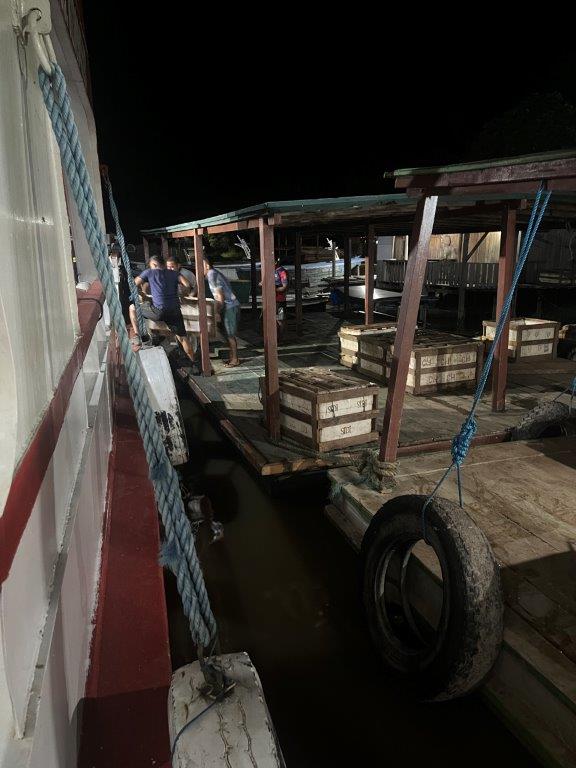 Another time we stopped outside an iceworks and loaded on styrene foam boxes in wooden frames. I imagine they were full of fish and ice. Working in the dark and in thongs it was interesting to watch the crew manually haul about 50 crates onto the boat. There was a small onboard ferry that would move things around once they were loaded on. The boxes must have weighed over 100kgs each. A lot of manual dragging and lifting but I guess they do it at least twice a week.