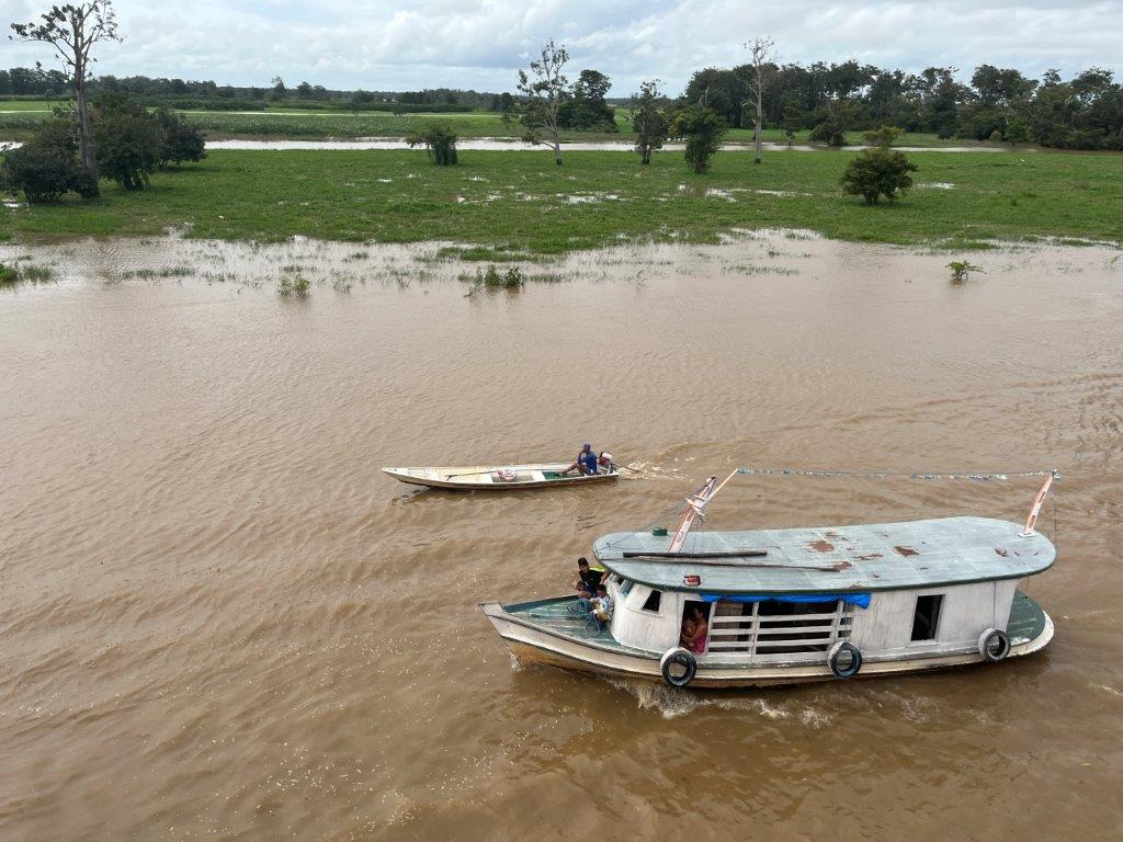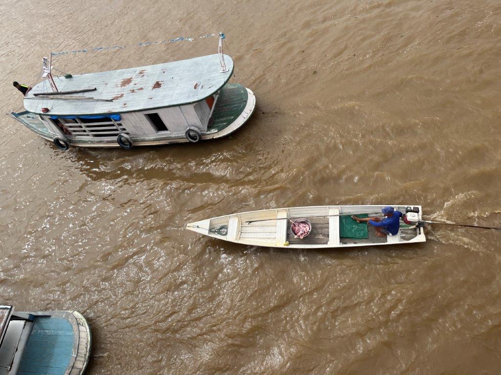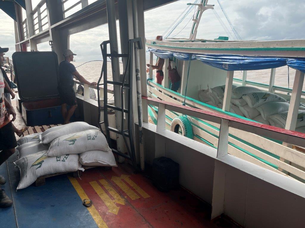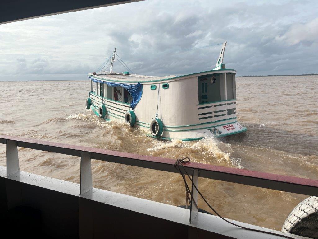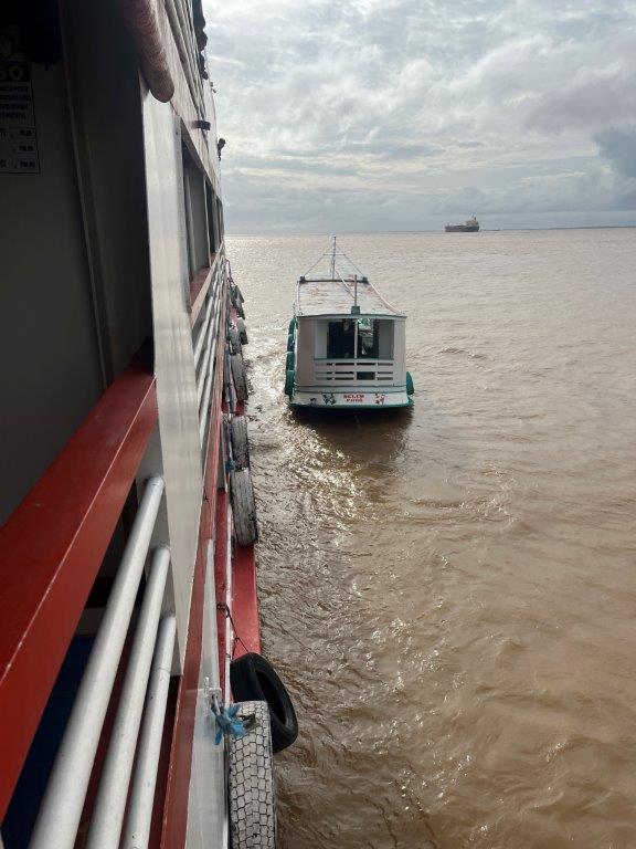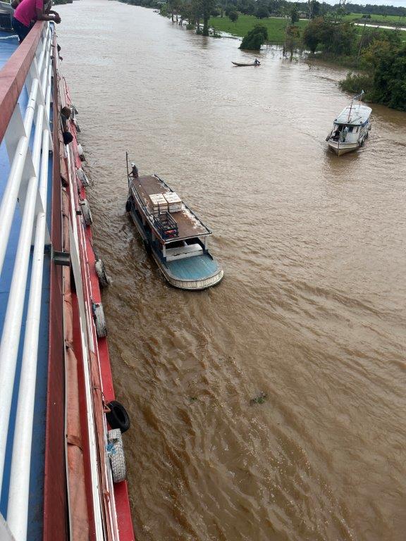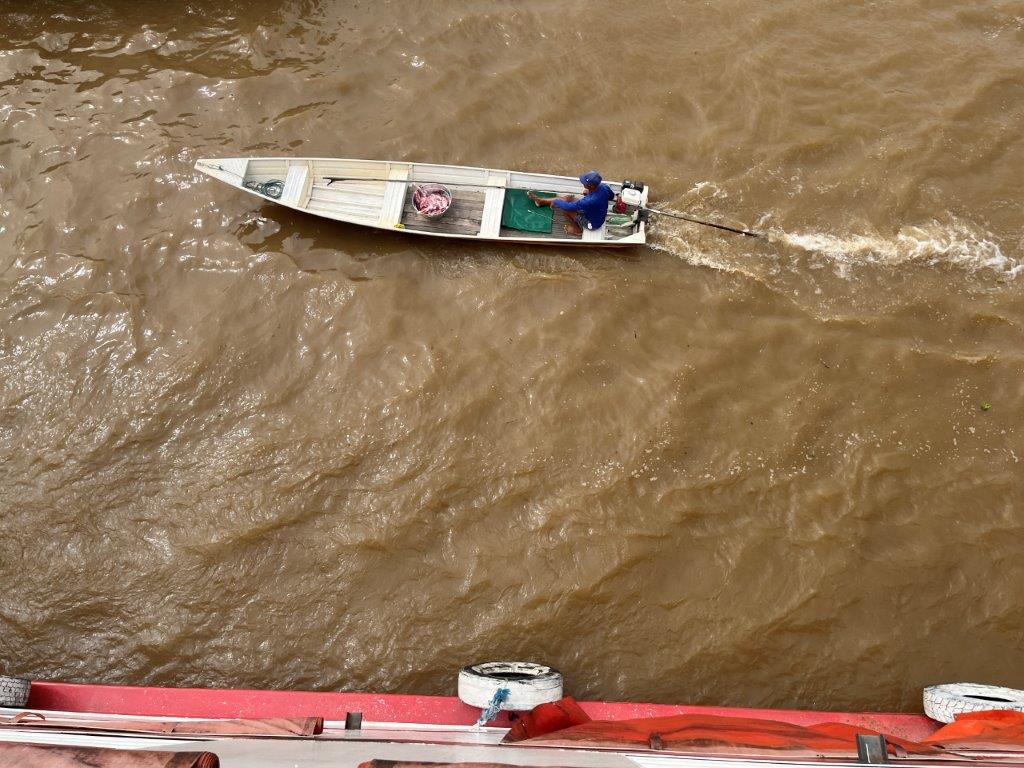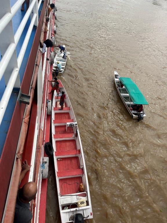 Other times we would just slow down and boats would pull up alongside and people would get on or off. Other times supplies like bags of flour or corn, or seed were dropped off and money exchanged. Other times just a couple of boxes of fish or some fruit. One time it was just a metal tub of freshly slaughted meat (which I guess we ate), and another time a big fish which I guess ended up in the kitchen as well.