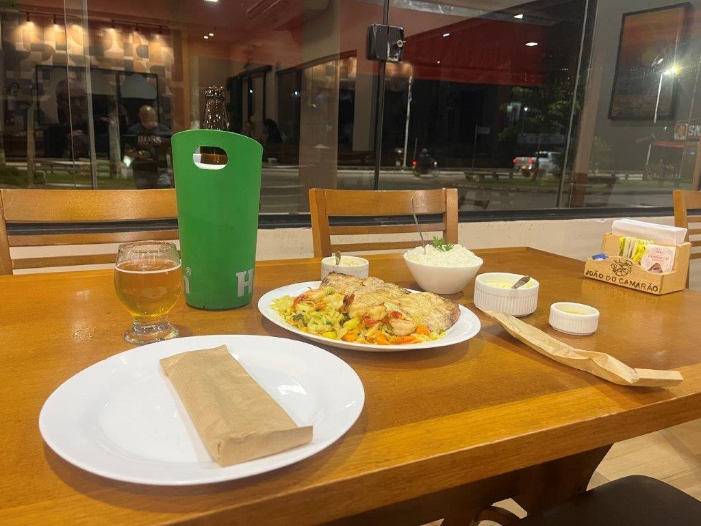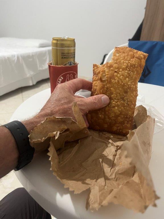 I returned to the hotel and had another sleep after my long walk. It was then time to eat but that turned out trickier than I had hoped. I was a bit early for Brazilians and also a Monday which didn’t help. I eventually found this popular couple making and selling some sort of deep fried goodness with meat. Fresh, so it must be healthy, and straight out of the hot oil, so it stayed warm for my walk back to the hotel where I dined in, with my yummy meal and a beer.