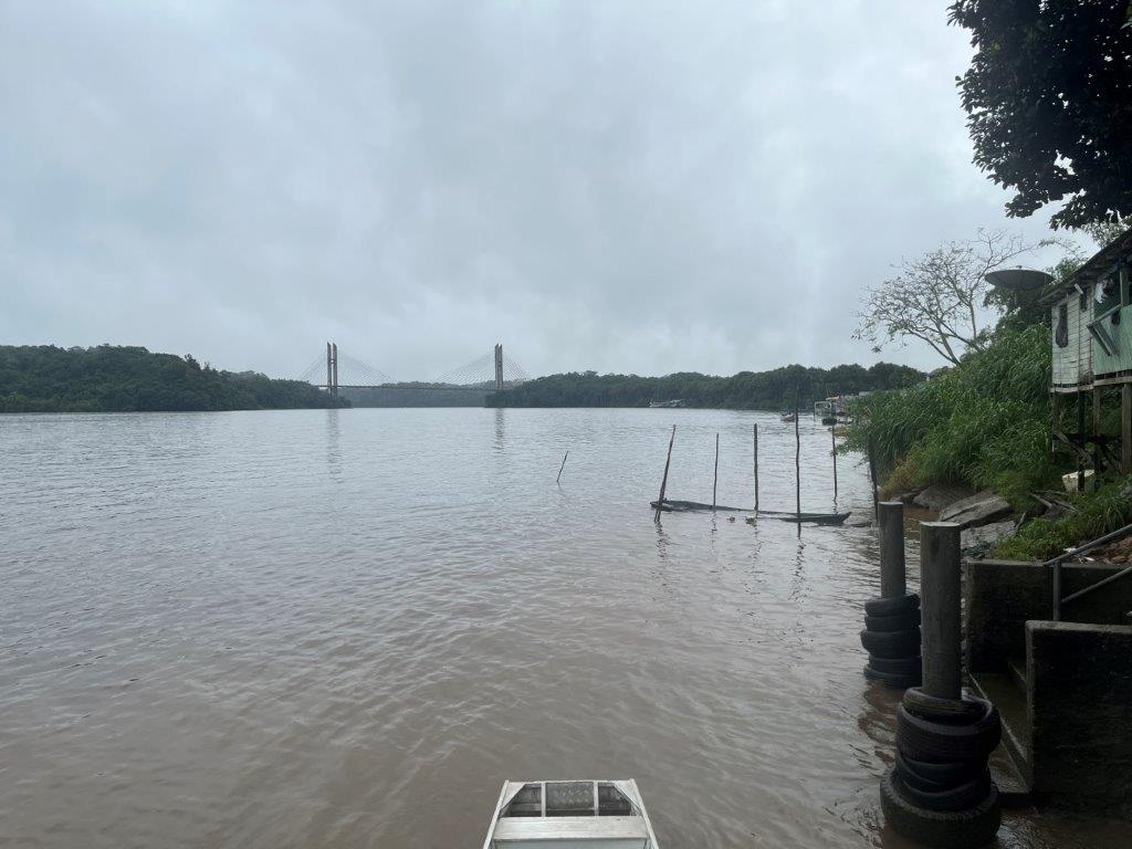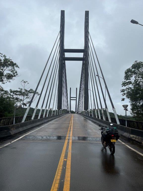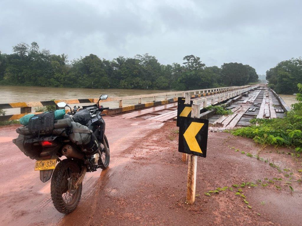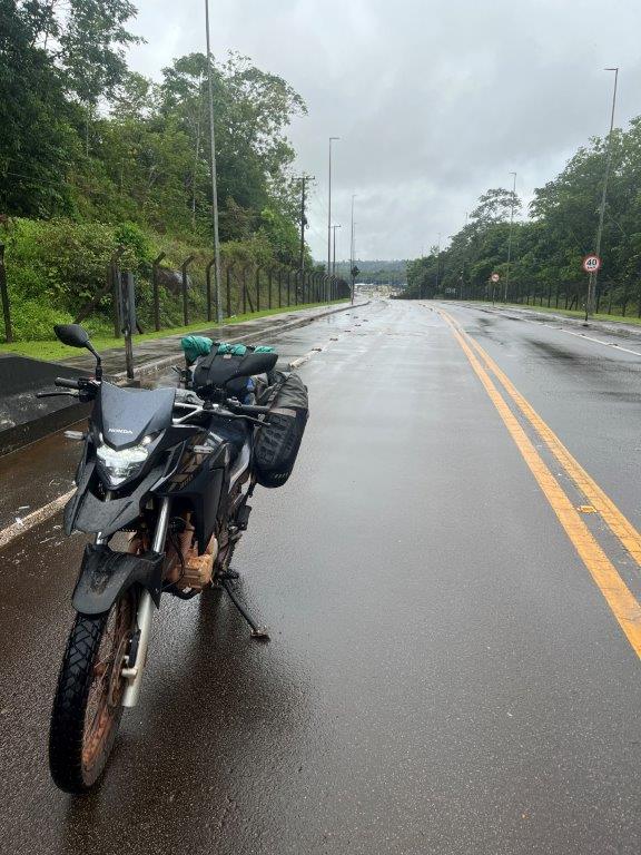 Today was my big day. I was going to cross into French Guiana. This is where they always ask you for your yellow fever vaccination certificate. I now had one, but it was Brazilian and on my phone. Not the standard yellow card most other countries have. Fingers crossed. After leaving the hotel I rode back down the street to the river to see if I could see the bridge I needed to cross, as the night before I couldn’t see it in the rain. And there it was. I took a couple of pics and then off I went to cross it. I was sort of hoping they would feel sorry for me being a drowned rat in the rain and make my crossing easy.