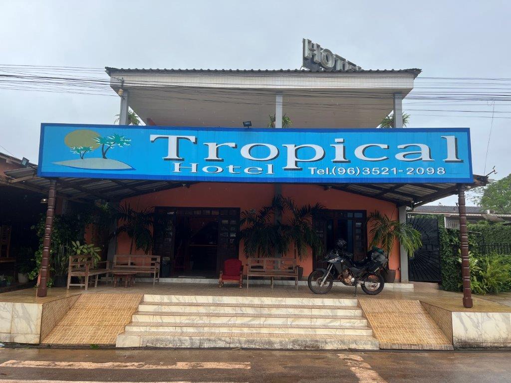 I arrived in the town of Oiapoque at dusk and it was still raining. I filled up with fuel first and tried to find a hotel on my phone but everything was so wet and the phone screen wasn’t working. Across the road was a hotel, but it was full and had no parking anyway, but they suggested another one a few blocks away. Thankfully it had a room and a carpark for the bike and it was cheaper. The Tropical Hotel ($52AUD). I was soaked. I hung everything up to drip dry in the bathroom. It was so damp and humid that I knew it had no chance of drying. My Mosko Moto luggage system is doing its job though and so all my gear was dry, and I was able to put on some dry clothes to go and find some food, once there was a pause in the rain.
