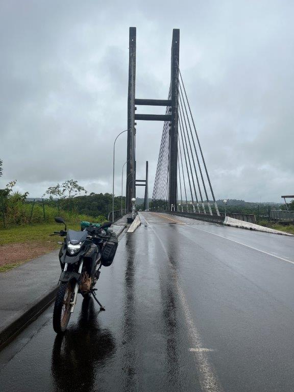 To get to French Guiana I had to cross a fancy bridge after leaving the small rainy border town of Oiapoque, Brazil. In the rain. In my wet gear from the day before. I was the only person, so I took advantage of the opportunity and took a couple of pics. Exiting Shane from Brazil was relatively easy, although clearing my bike took a bit longer and when they disappeared into a back office with my bike paperwork for 20 minutes I was beginning to worry that they were adding up the fines I had accrued over my time in Brazil for speeding and toll avoidance. When they finally returned they were all smiles and friendly and wished me a good trip. Phew.