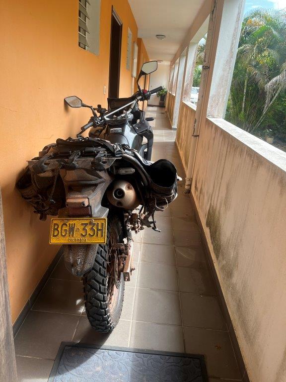 Next day I loaded up my bike at the front door because it was still raining, but regardless, I had to ride to the border town of Saint Laurent du Maroni to be able to cross by ferry into Suriname. It was only 3 hours on a good road and I had worked my days so that I arrived there on the Sunday night, so that I could get my tourist visa first thing on the Monday morning and then take the first ferry across the river. That plan didn’t work.
