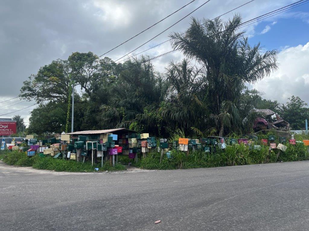 I did cross a cute bridge into a nice little riverside town for lunch. Across from the church there was a woman selling food. I have no idea what it was, but it tasted nice and was a good price. I’m still struggling with the people speaking French. As I entered Saint-Laurent-du Maroni, let’s just call it SLdM, I saw a few side roads with letterboxes on them. There must be a few people live down this street.