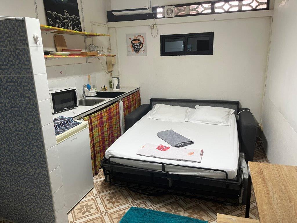 It was a very small apartment but had everything I needed. The sofa bed took up most of the floor space. I had to take everything off my bike and stack it in the shower cubicle as that was the only free floor space. But that was fine because it was all wet anyway. It was a strange little collection of apartments and people but felt safe enough.