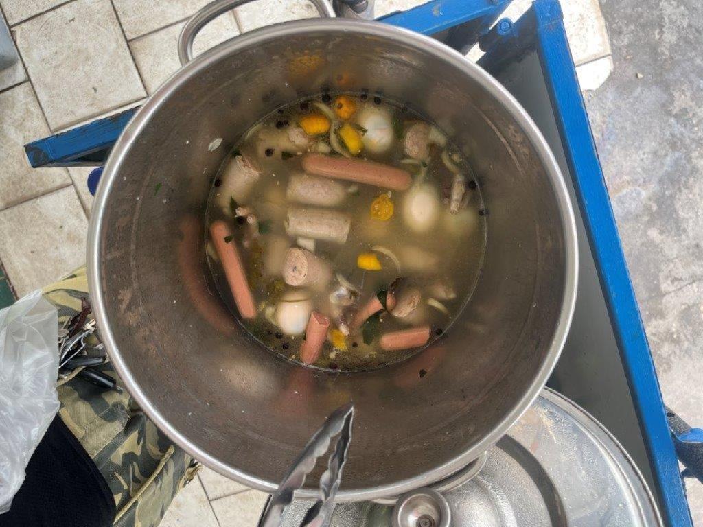 I left my bike at the port and headed up the road to where I could see some shops. Outside was a young guy selling stuff from a big saucepan. It seemed popular so I peered in. A few too many chicken feet for my liking but someone bought most of those and then it looked better. The guy was nice and spoke a bit of English and offered me a free sample. I then felt obligated to buy some. Turns out it was delicious. You just choose an item from the pot and he puts it in a small plastic bag. I ended up having 4 go’s. Mainly the sausages, which he makes himself every day. We had a great chat between people rocking up and buying food. So many people were drinking cans of beer and it was lunchtime. He said it is a big problem in FG. We exchanged WhatsApp numbers and then I went back to the port where I admired some nice bundles of wood, while I waited for my ferry to arrive.
