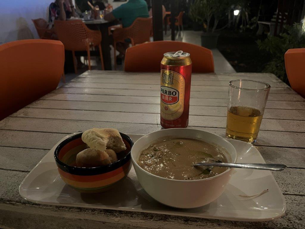 The city had lots of old buildings. Some restored and others begging attention. I had to go and find an ATM which gave me some Surinamese dollars and then went to a trendy little restaurant which was just down the road from my accommodation and had a local beer and a bowl of crunchy peanut soup which was a local dish. And was really nice.