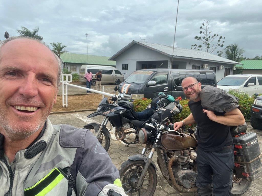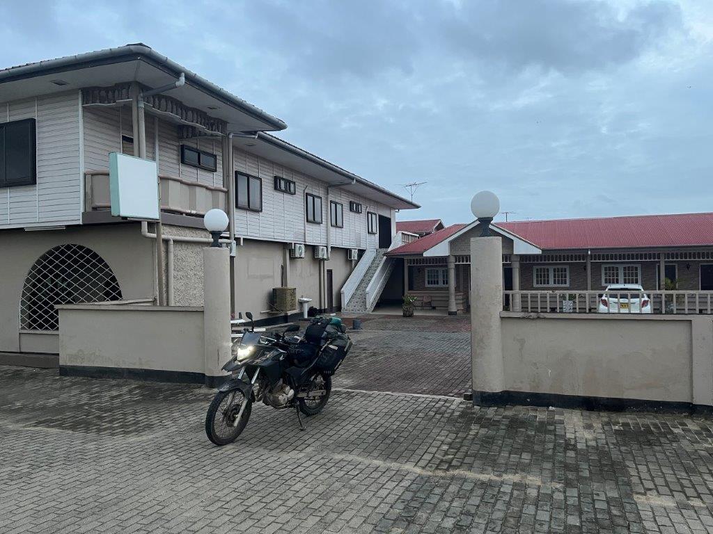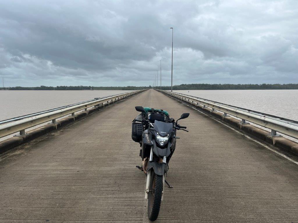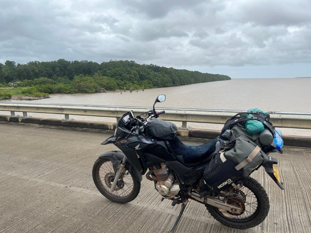 Somehow in Paramaribo I also managed to squeeze in a bike oil change. On a footpath outside a scooter shop. I apologised to my bike and promised it a flash service next time. From the capital it was a 4 hour ride to the lovely named, South Drain, which is where you catch the ferry across the Courantyne River and end up in Guyana. Getting ferry details was similar to many places in South America. Times vary greatly and there’s always rumours about them no longer operating. Apparently the ferry was running again this week but you needed to be there at 6:00am for the 10:00am ferry. I took that with a grain of salt because they always seem to be able to squeeze a bike on as long as the ferry was still attached to the wharf. But I decided it would be a good idea to arrive early though and so I stopped the night at a small town called Nieuw Nickerie which left me only half an hour to ride next morning.