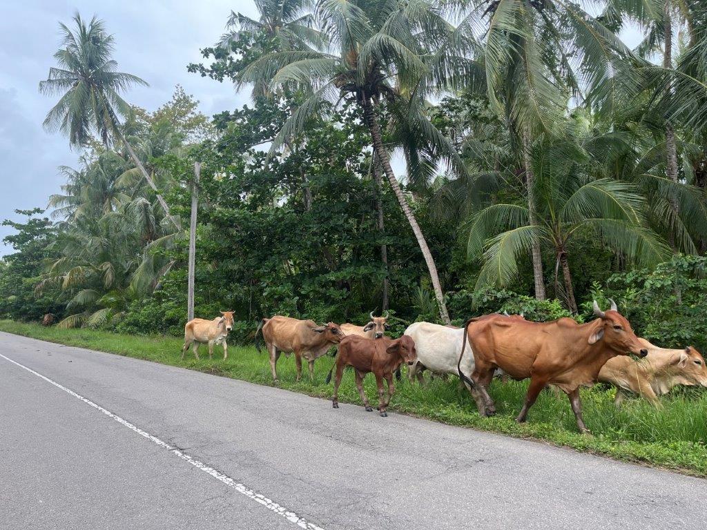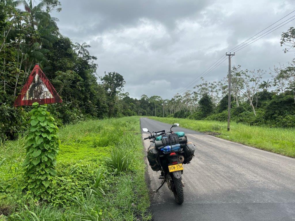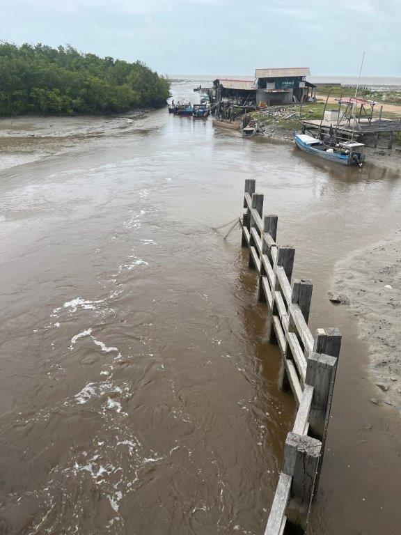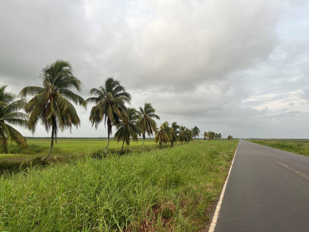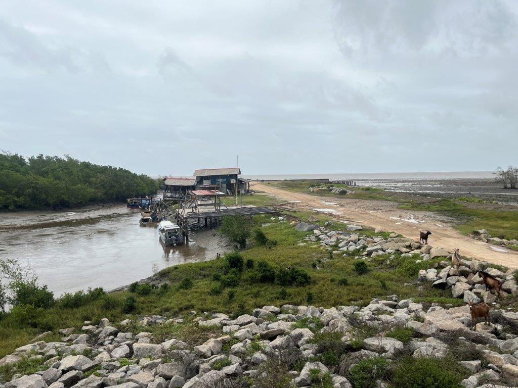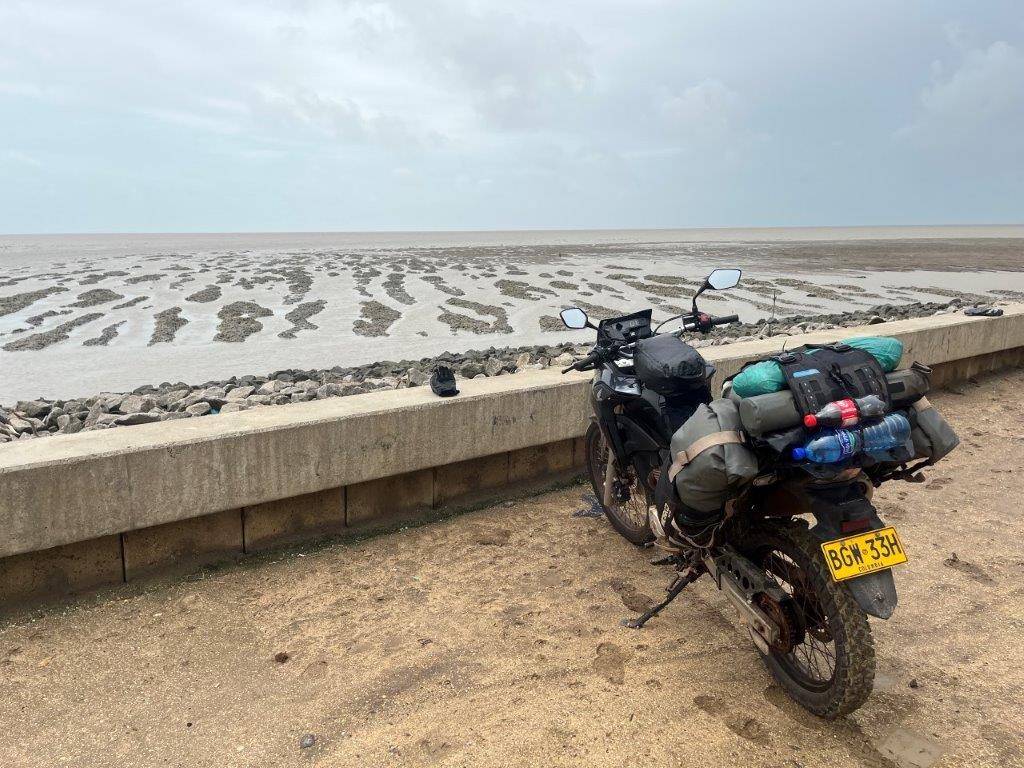 It was a nice ride, and I stayed dry. Lots of jungle and river crossings. I found it interesting how the vines were trying to reclaim the road signs. And some cows. No jungle wildlife. I could see from the map that I was following along the Caribbean coastline and thought it was strange that there were no towns on the coast. I saw a crappy dirt road heading north and only a few kilometres long and so I went for a ride. The joy of having a good off rode bike. There were a few scattered dwellings and a canal and some fishermen and boats but it didn’t take me long to see why there were no towns along the Suriname Caribbean coastline.
