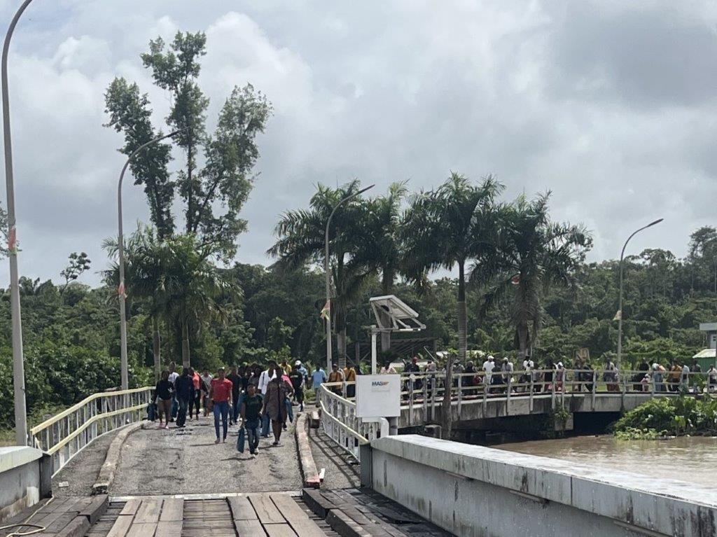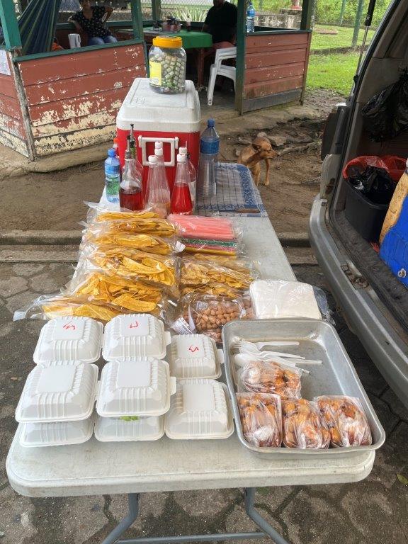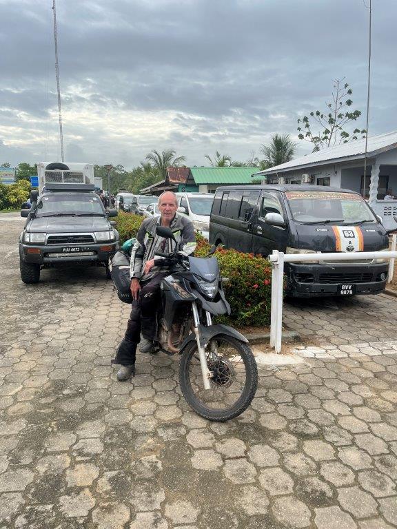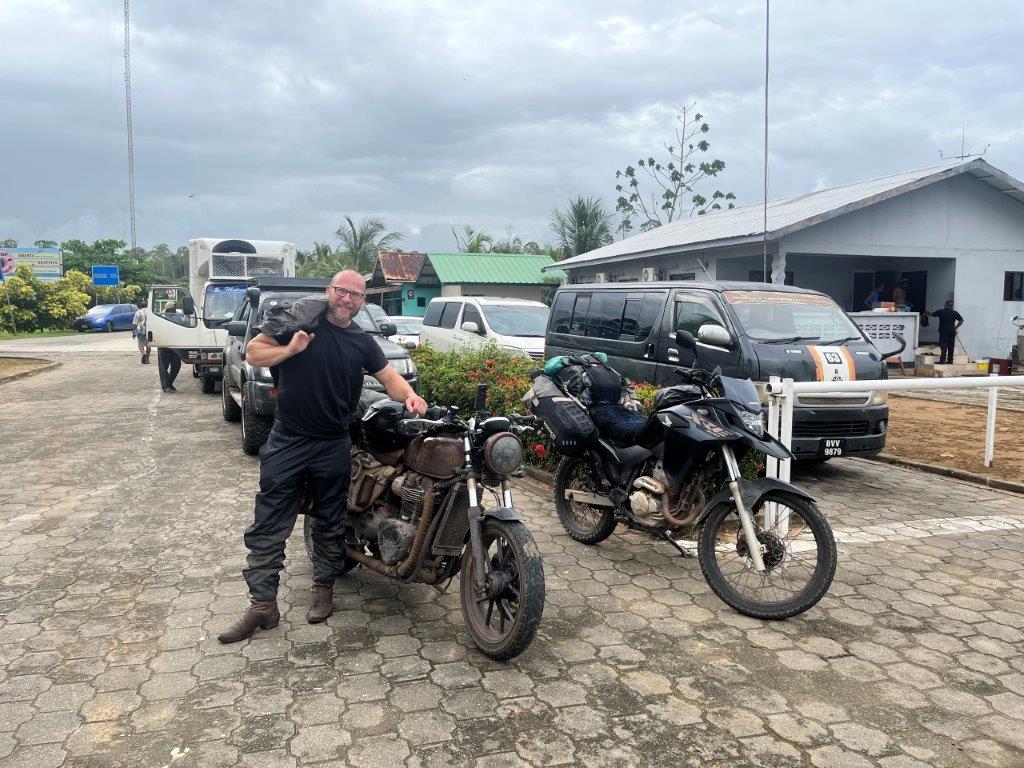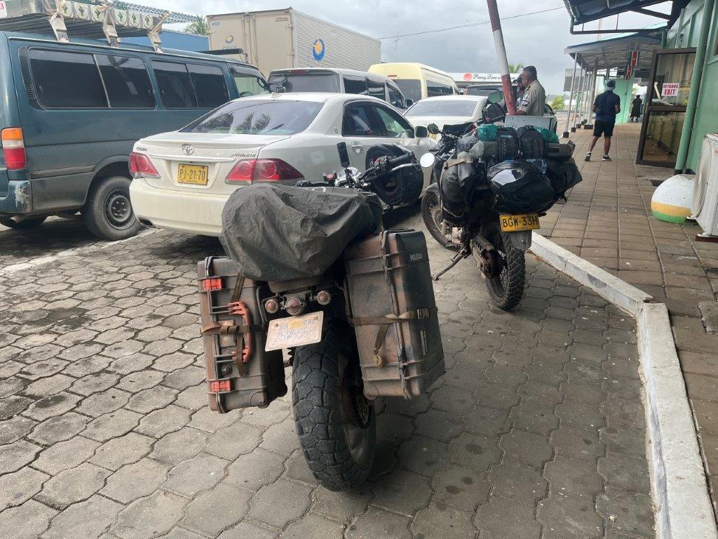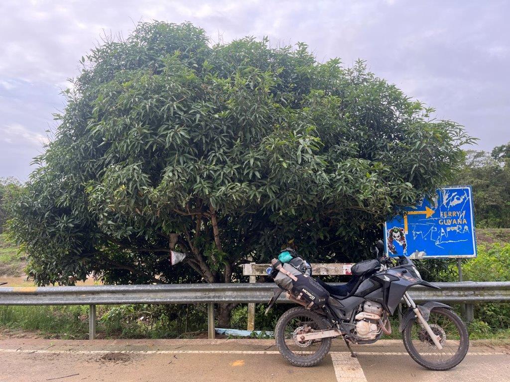 I rode into the Canawaima Ferry Terminal and there was already a queue of a dozen cars. I just rode to the front and parked my bike. The terminal is also the immigration post for departing or arriving in Suriname. The country of Guyana was a half hour boat ride across the river. You couldn’t see it from Suriname. There were a couple of buildings and a shop on the back of a small van. I bought some breakfast off the van guy who was also one of the money changers and changed a few Euro so that I would have some money for when I crossed into Guyana. He was also helpful with immigration information. I had to do an online form on my phone which I didn’t know about but was grateful to find out about and complete.