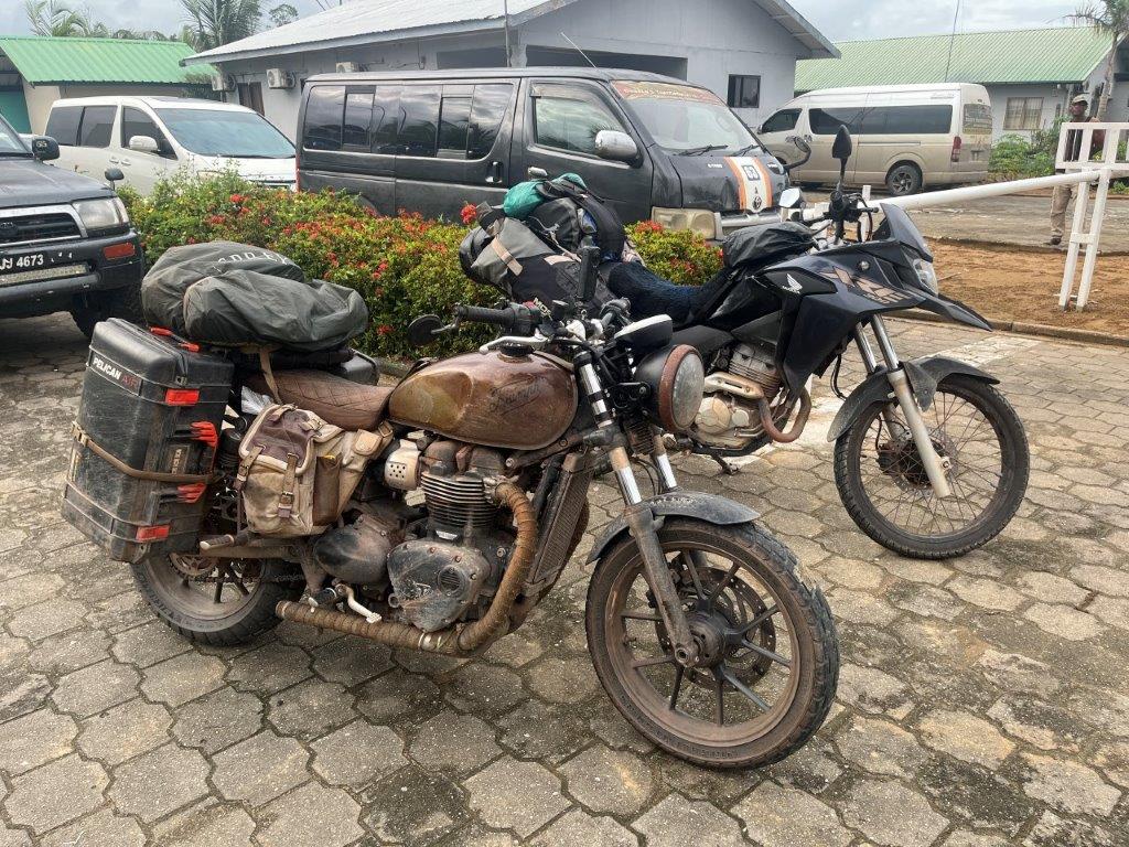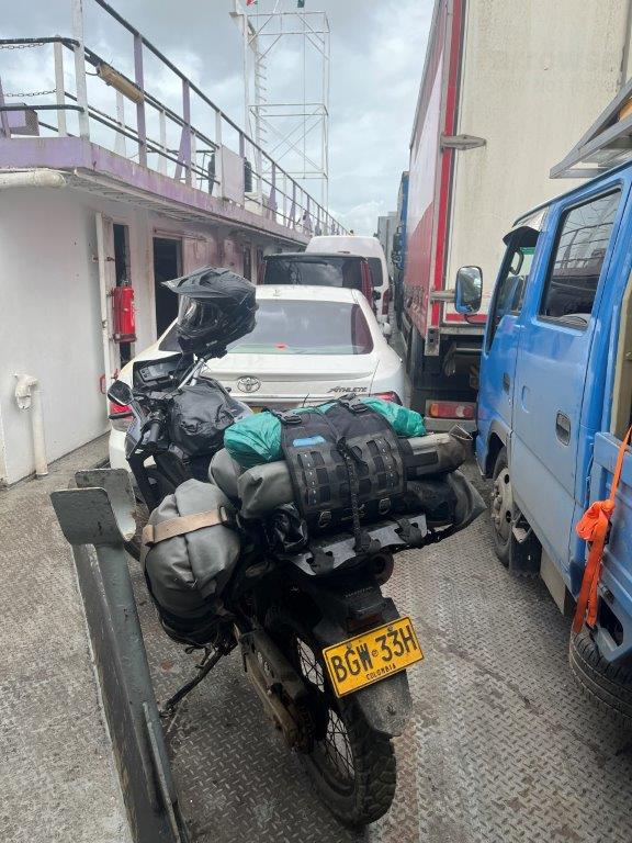 As we waited in the line we were asked for our documents, including our yellow fever cards. The immigration guy somehow got distracted and we just rode through without needing to show it to him (but we weren’t so lucky on the other side of the river though). It took less than an hour and we were called onto the ferry. It was big enough and well packed, to take most of the vehicles in the queue. All the people boarded just before departure. There seemed to be a lot of them. It was a smooth crossing and we chatted away and also met a Canadian woman who was going in the same direction as us. She was sort of hitch hiking? A bit different but pleasant enough.
