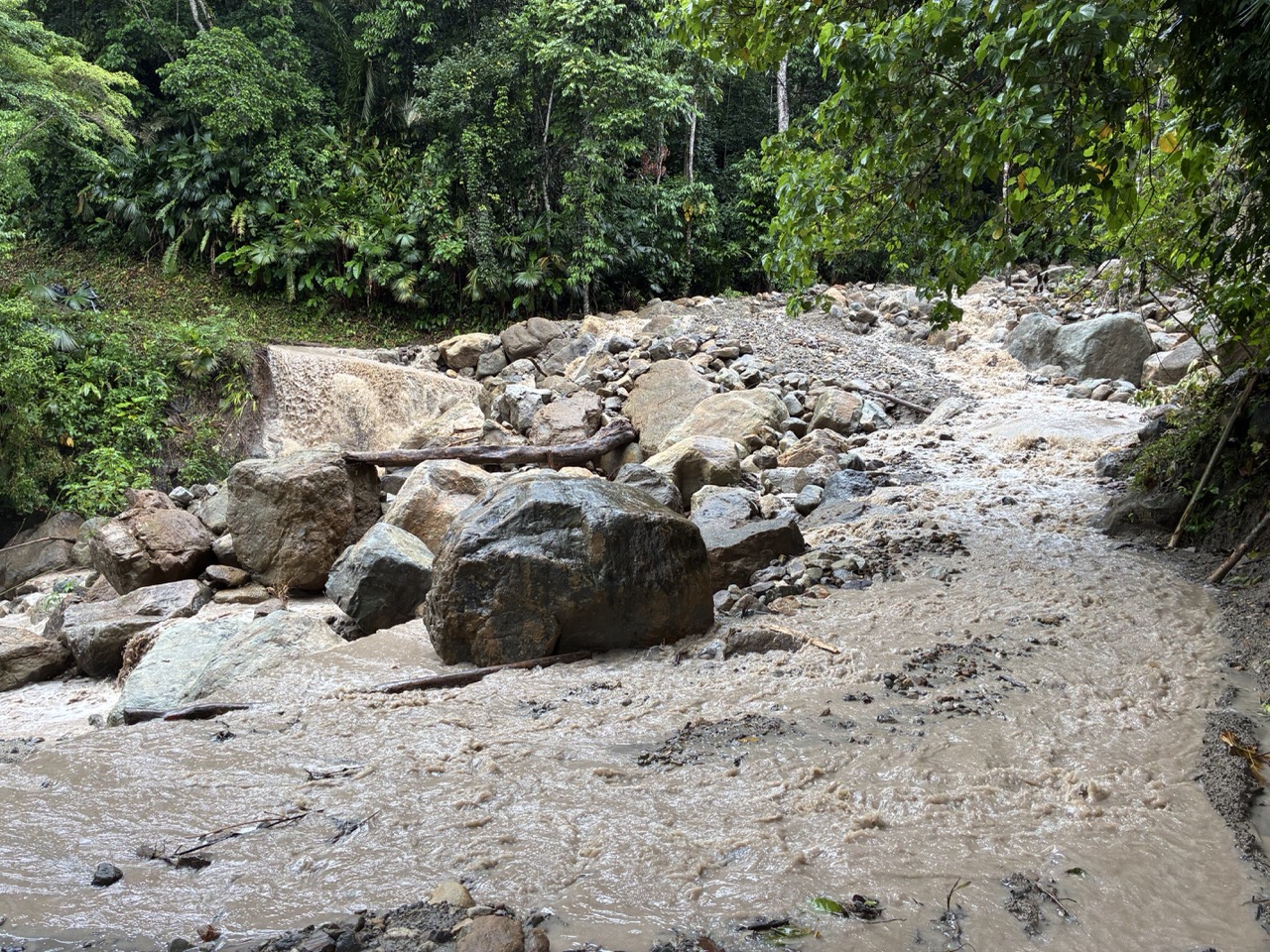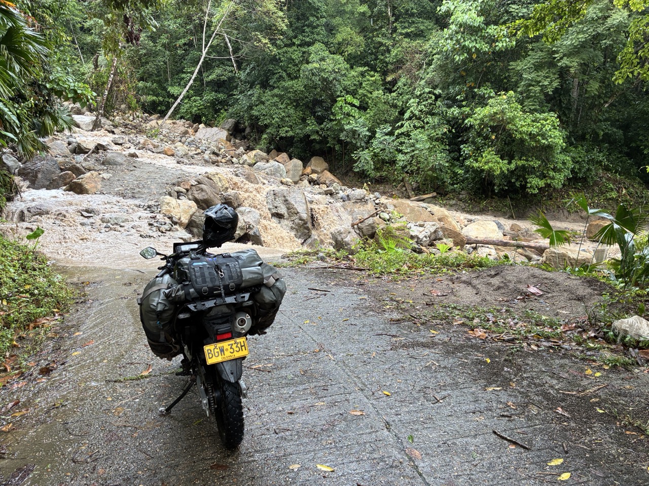 I seemed to have summited the mountain and was heading down but then google started saying my arrival time was getting later and later. I was riding much slower and the road had deteriorated a lot. I was now crossing rivers but they had concrete bases so that was okay. Then the rivers got deeper and flowing much faster. I paused before I crossed them. I then realised that google had taken me on a long detour away from the main road. I was pretty annoyed but could see that I only had about 7kms to go and then I would be back on the main road (see green circle in map below). So I continued and was glad that I didn’t have to go back on the same road. And then with less than 5kms to go I came down a hill and the road was gone. It was washed away be a landslide and was now a river. And flowing fast. I parked the bike and walked through it. It was deeper than my boots, rocky, and brown water flowing fast. It was hard to walk through.