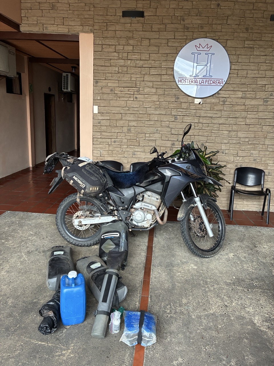 I made it into La Pedrera just on dusk (see red pin on map). One hundred kilometres from where I started. There was only one hotel, Hosteria La Pedrera, which didn’t have great reviews but had lots and lots of parking inside and outside and was $25US. I unloaded my stuff and then went for a walk. A small town. Not overly exciting. The only petrol station was closed but I saw a shop selling 10 litre plastic containers. They were used containers and only a couple of bucks. I asked the guy if he could sell me one and put fuel in it. Yep. $10US. So I paid and then went back later and picked it up.