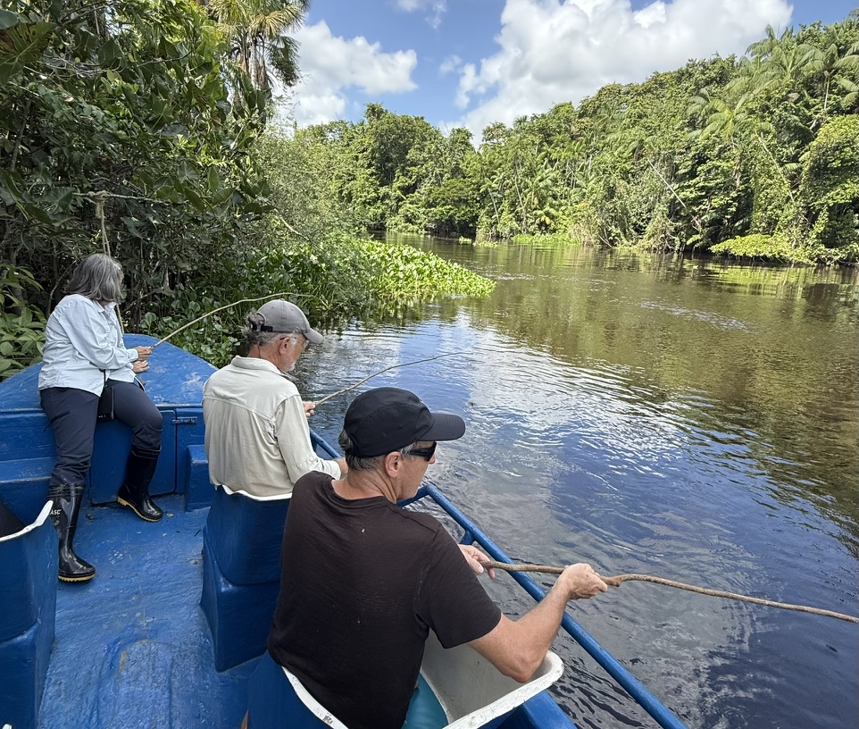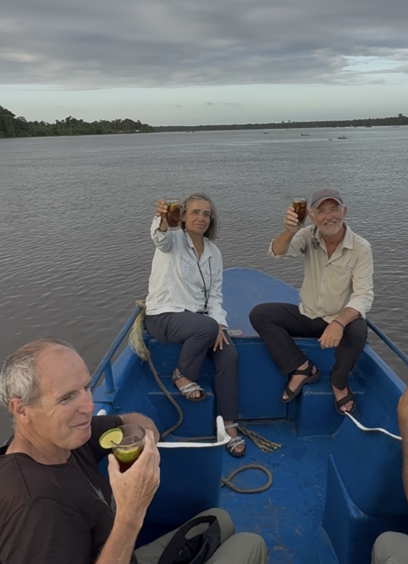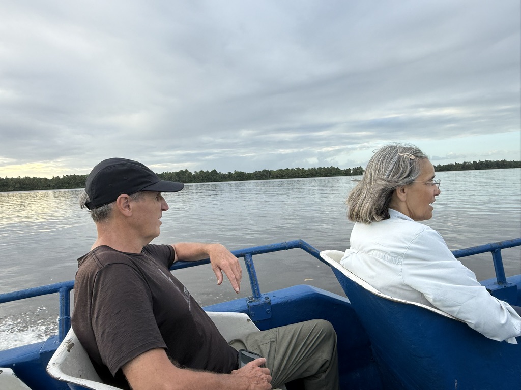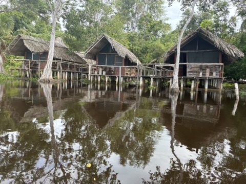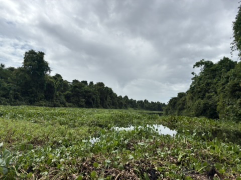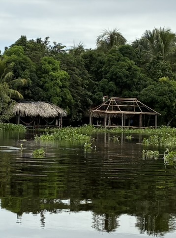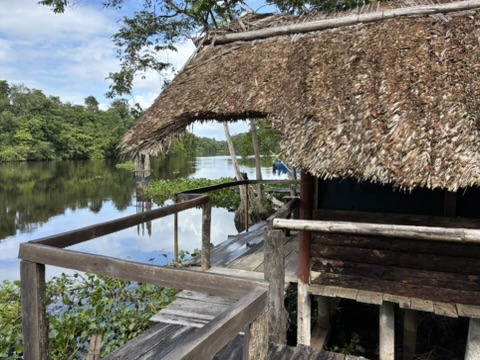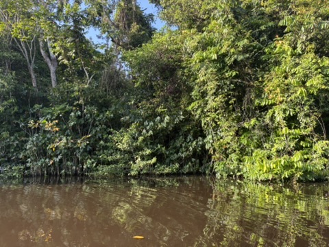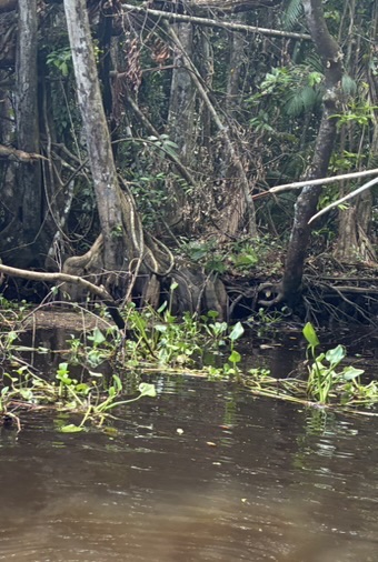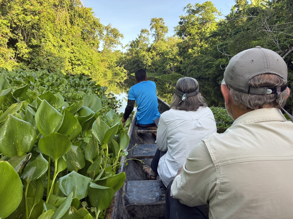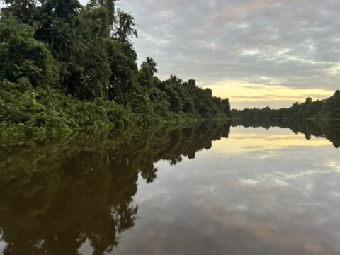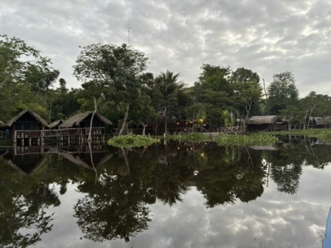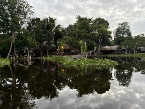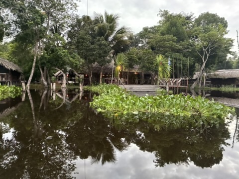 From there we went down stream a bit and watched the sunset while sipping our sunset drinks and watching river life. In the smaller arms of the delta there was a lot of floating plants. Sometimes they blocked the path of the boat and we had to forge through them. It was back to the camp and yet another nice meal. I seemed to have missed taking any food photos. The Swiss couple had spent several years travelling around the world in a yacht with their children. They spent a month at the remote island of Niue about 2 years after we lived there. They also lived in Australia for a year and had been to Broome. We had lots of interesting chats over the two days. I slept well listening to jungle noises and howler monkeys.