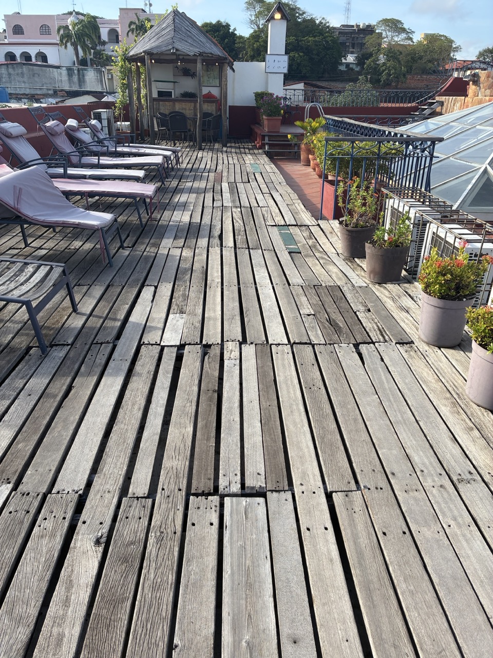 The Casa Grande in Ciudad Bolivar is a beautifully restored building. It has a dozen or so rooms around a central courtyard. There’s lots of interesting old nicnacs sitting around and a grand spiral staircase leading up to a big roof terrace with a small pool and really dodgy decking. There are great views over the city and along the Orinoco River. The first ever bridge across the river which you can see in the background was only built in 1967