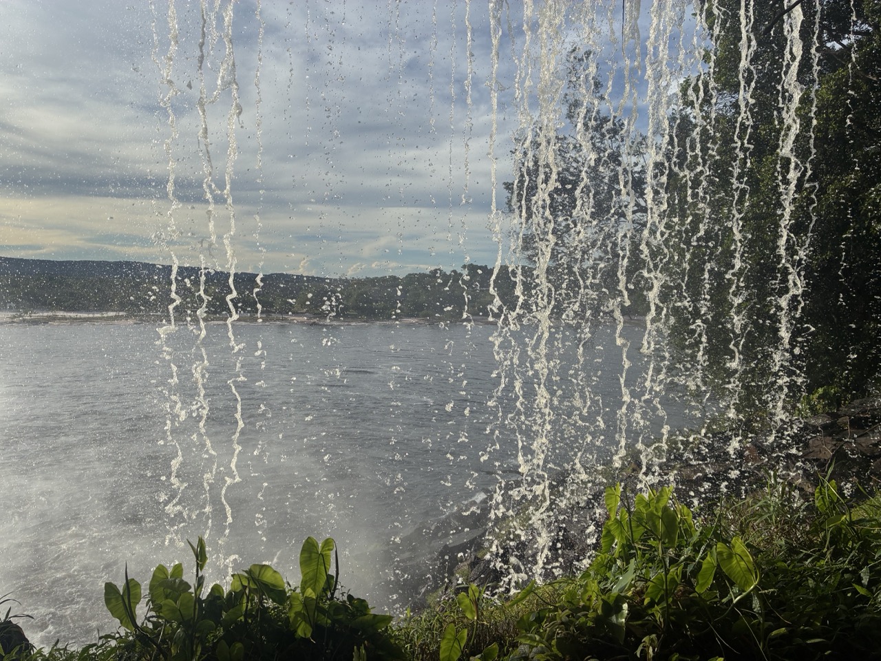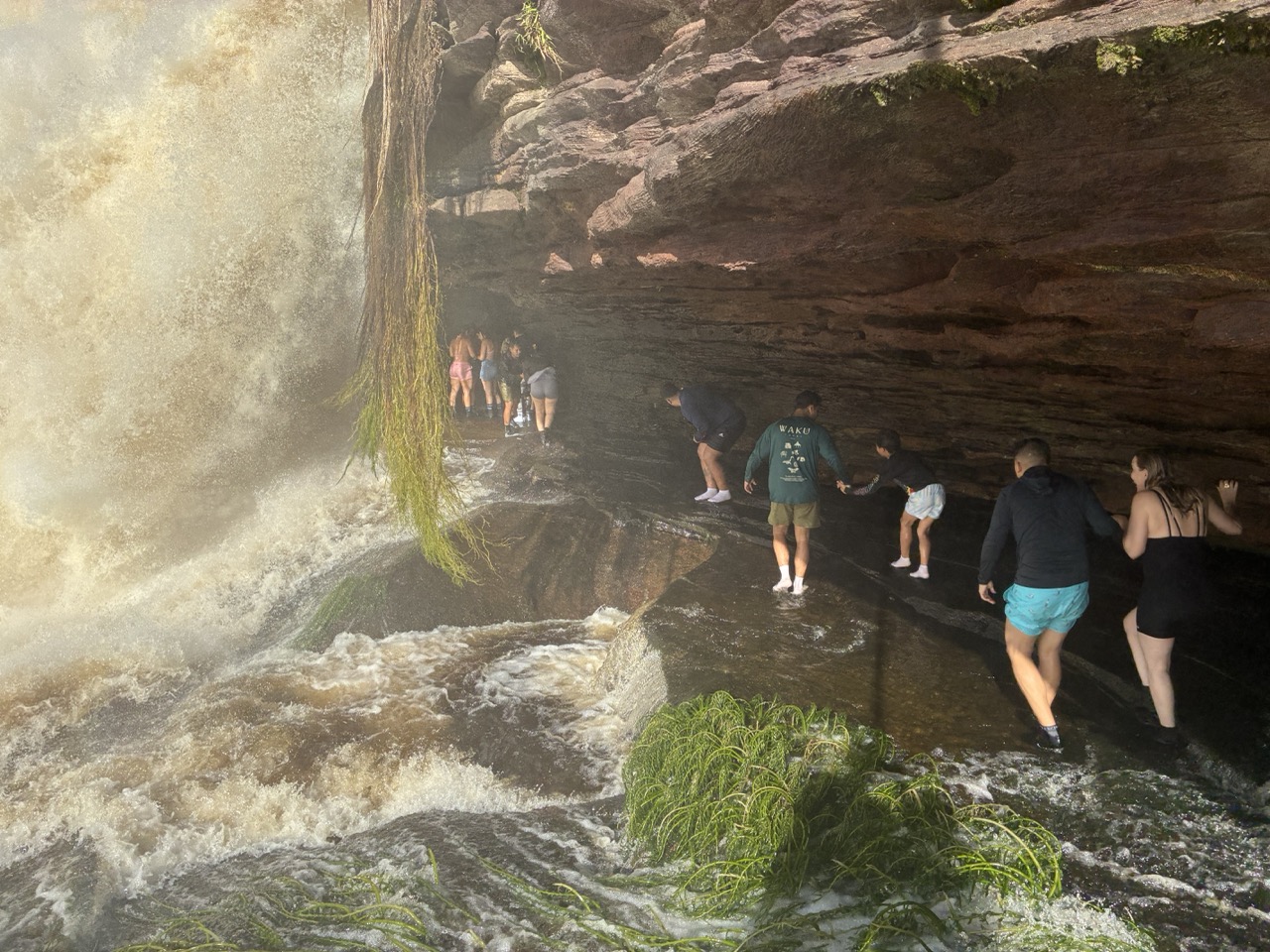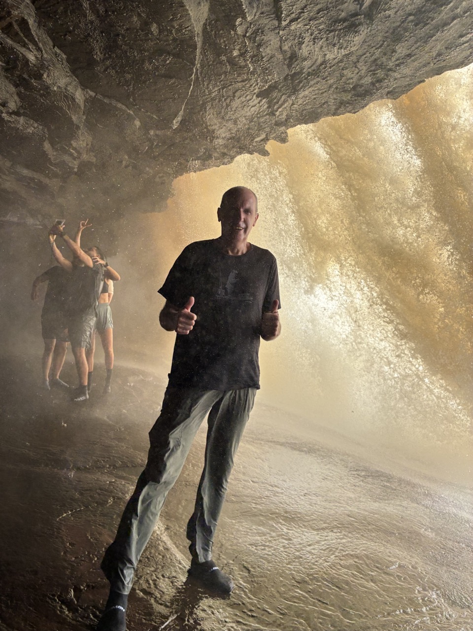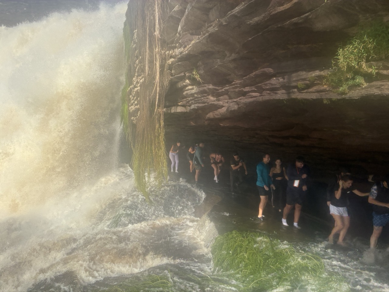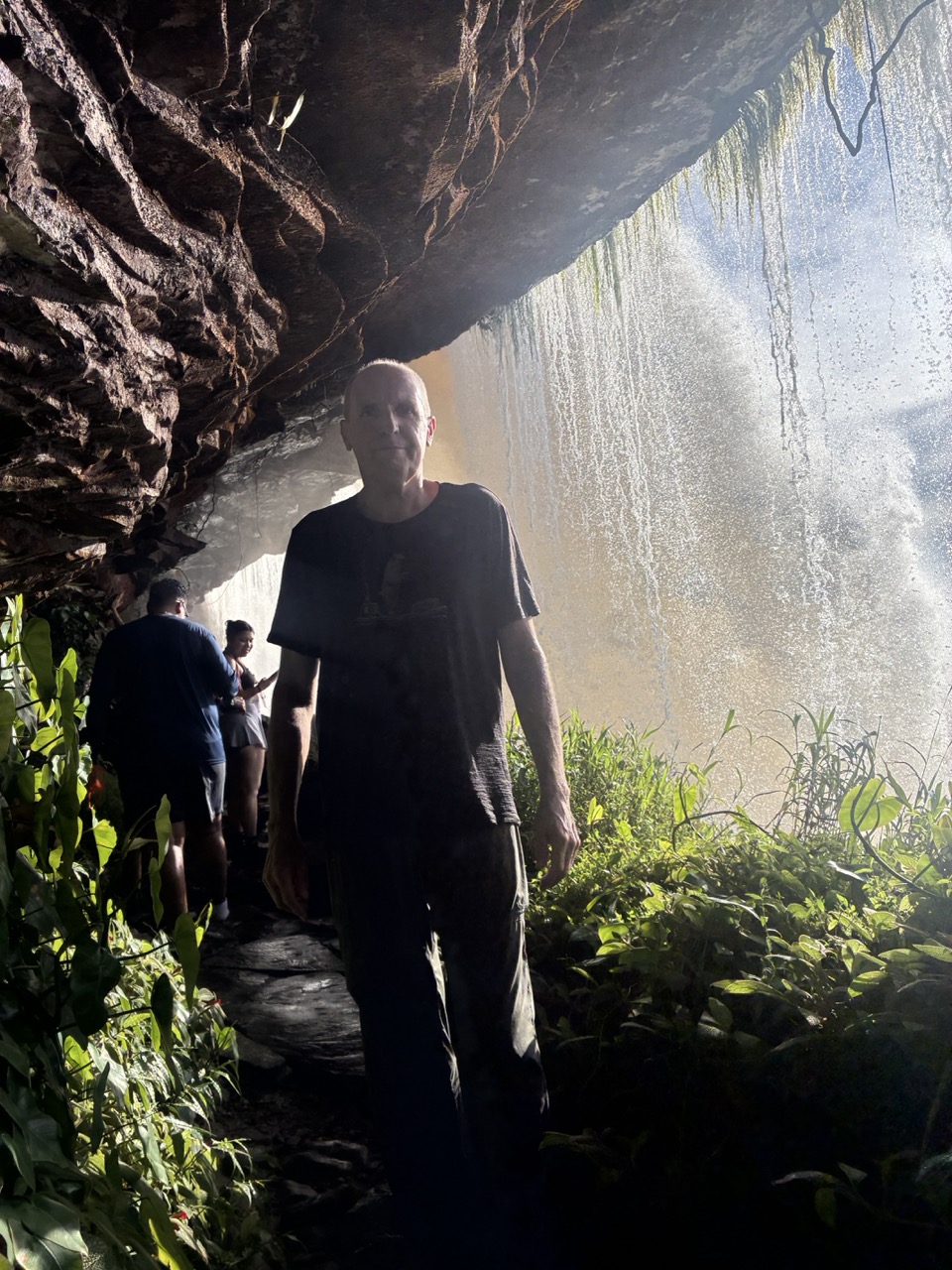 The young girl and I boarded a boat with people from the fancy hotel. And off we went to the waterfalls. Not just to them, but inside them. Everyone else obviously knew what was happening and had come prepared. I just went as I was, which was fine, as the weather was lovely. They would never let you do this stuff in Australia. One slip on the slimy rocks and you’re into the falls. They tell you to take off your shoes and just walk in your socks. And it was slippery. The guides did take your hand if you looked scared. Some people had brought special socks with them.