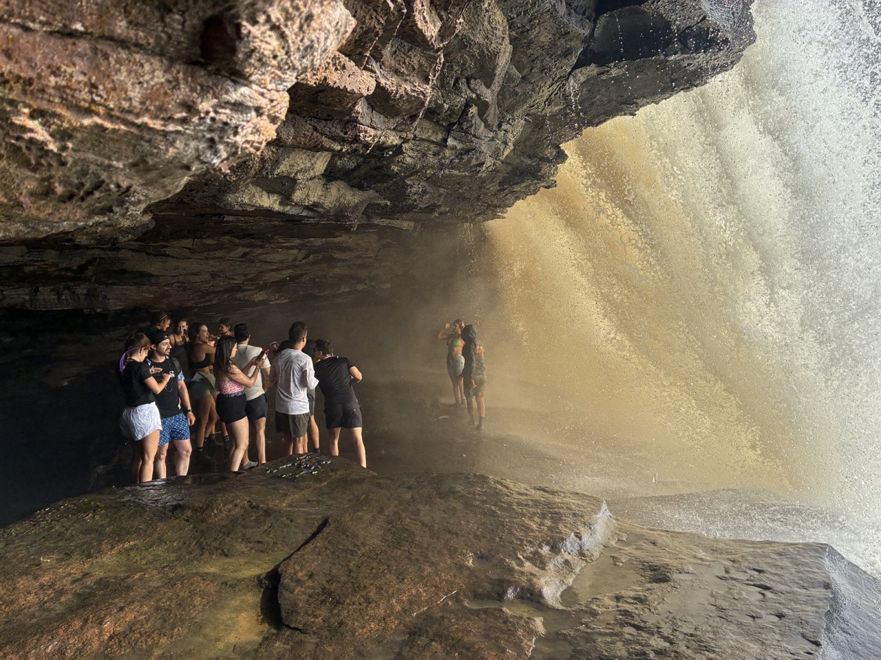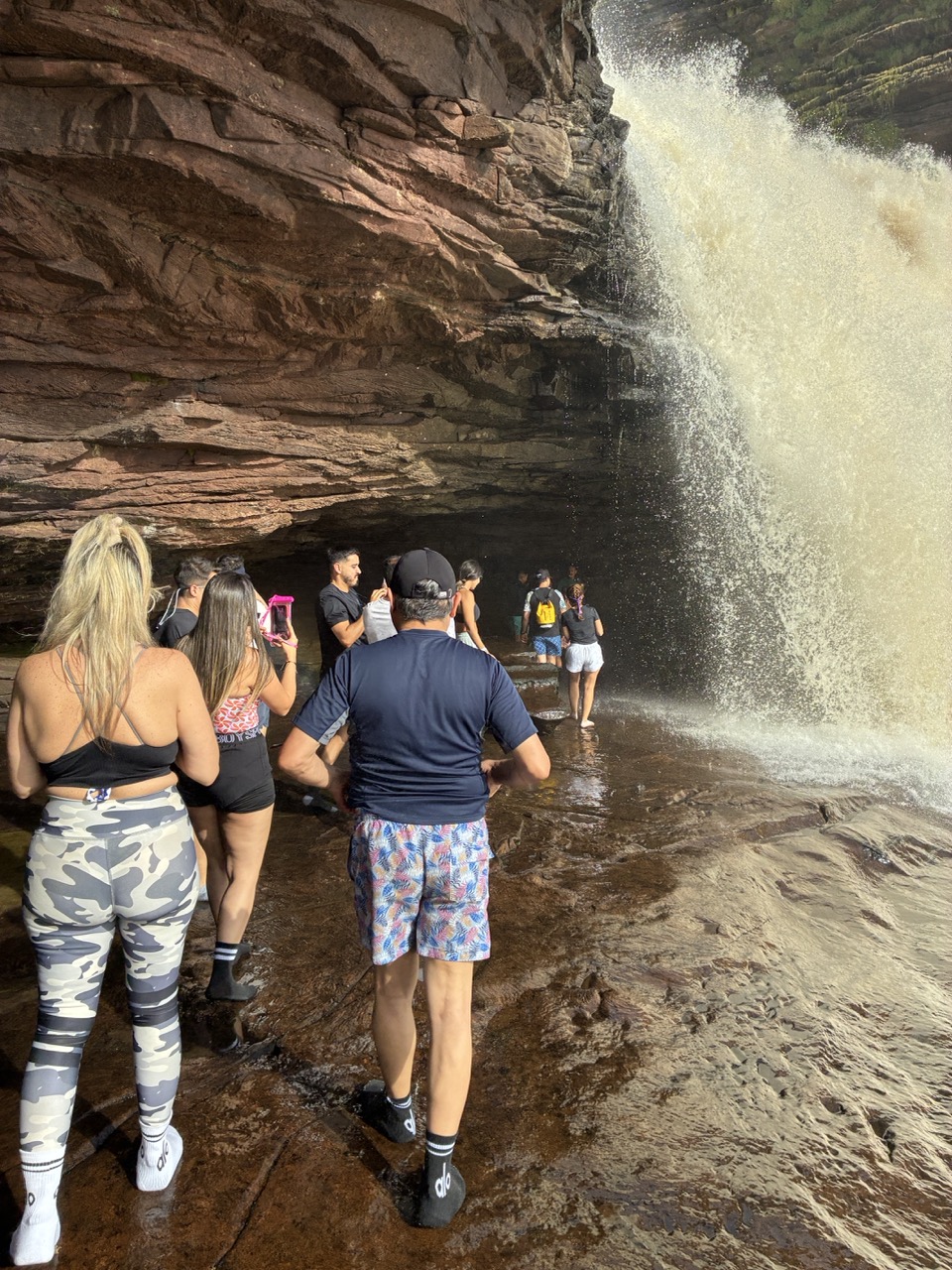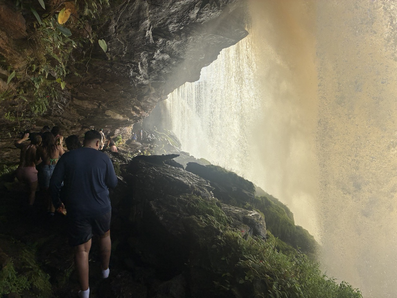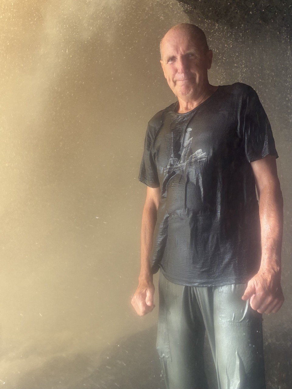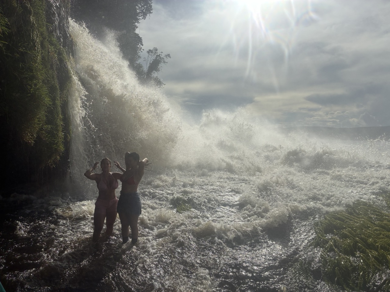 The young girl and I boarded a boat with people from the fancy hotel. And off we went to the waterfalls. Not just to them, but inside them. Everyone else obviously knew what was happening and had come prepared. I just went as I was, which was fine, as the weather was lovely. They would never let you do this stuff in Australia. One slip on the slimy rocks and you’re into the falls. They tell you to take off your shoes and just walk in your socks. And it was slippery. The guides did take your hand if you looked scared. Some people had brought special socks with them.