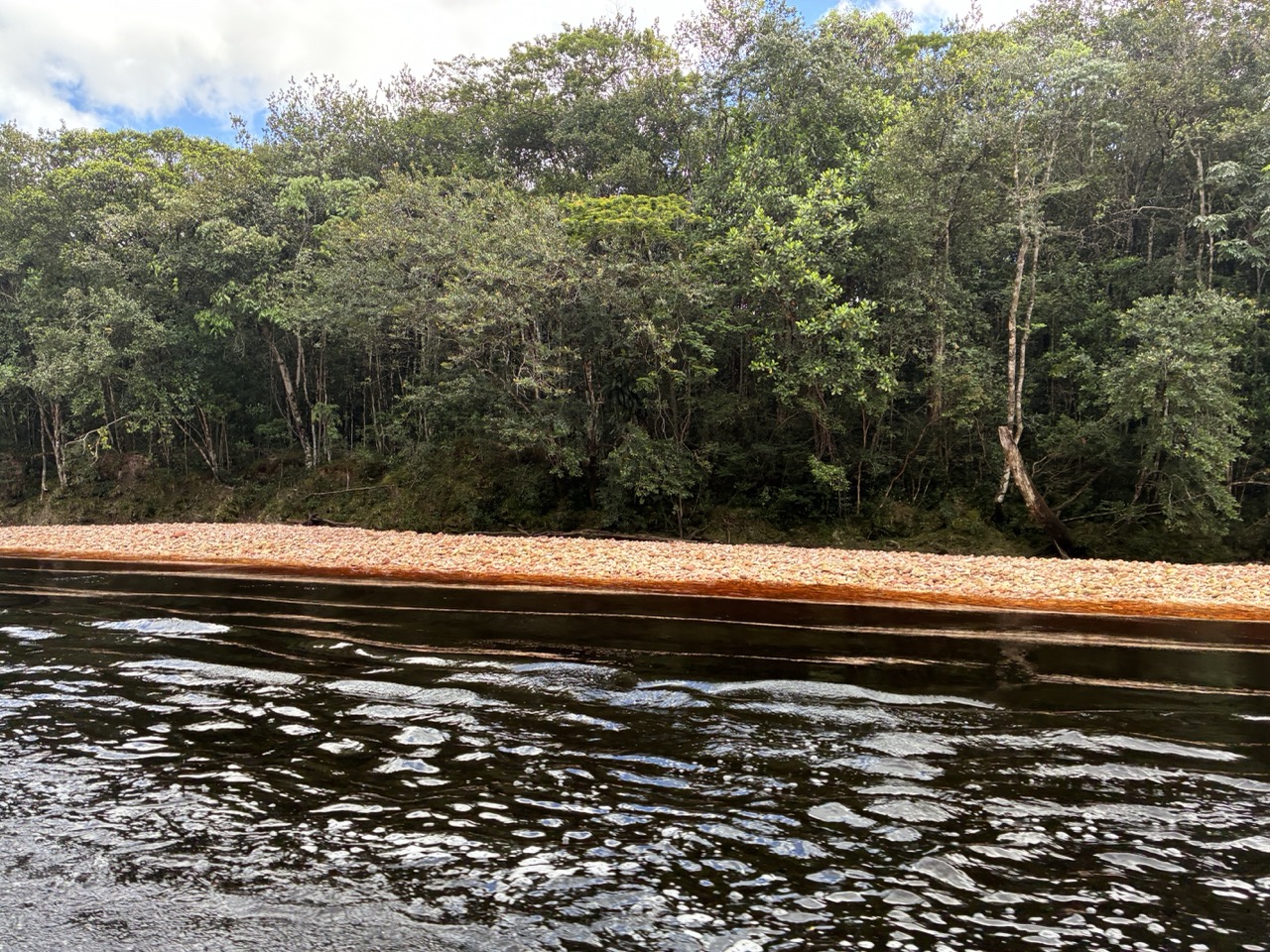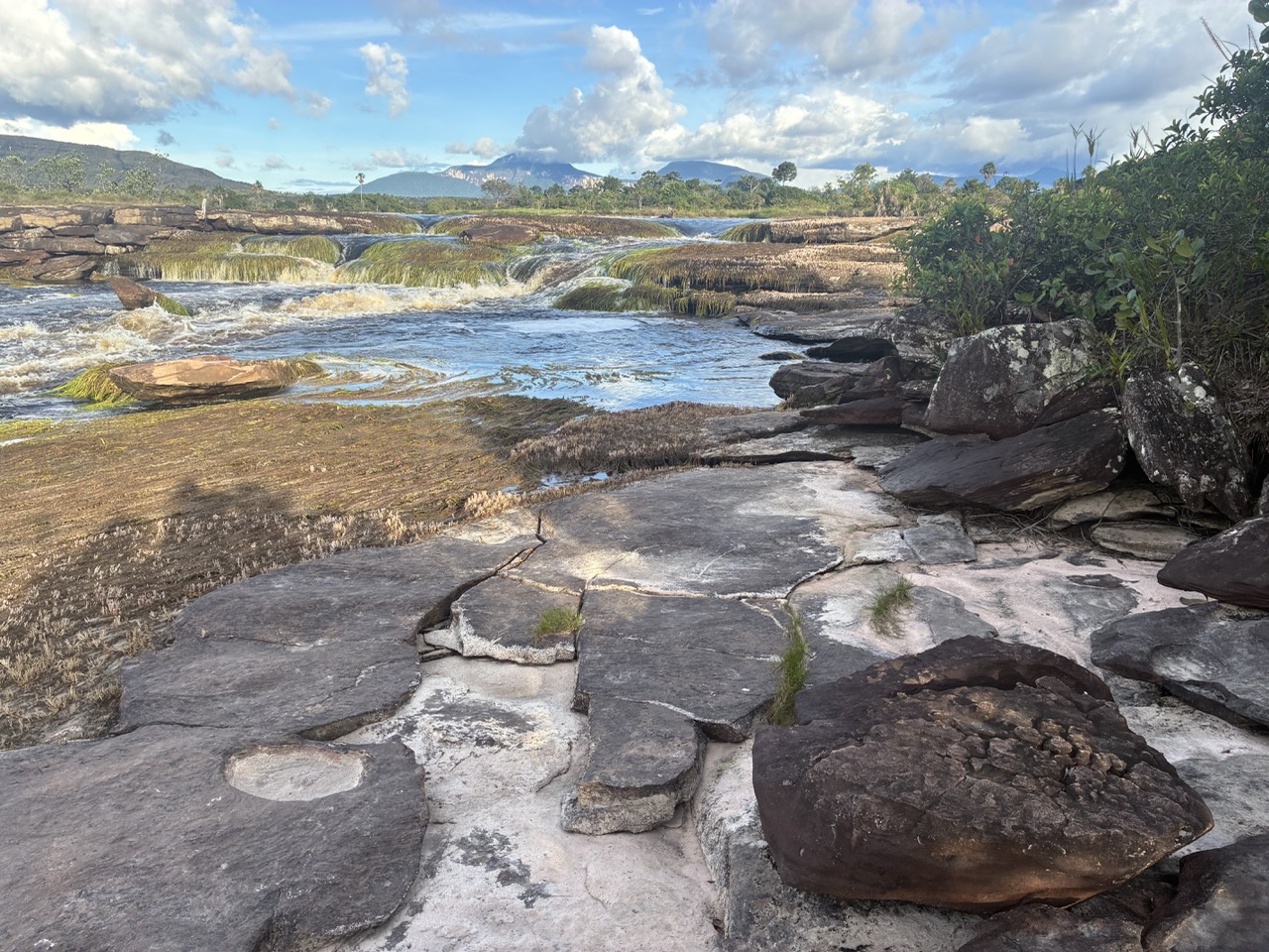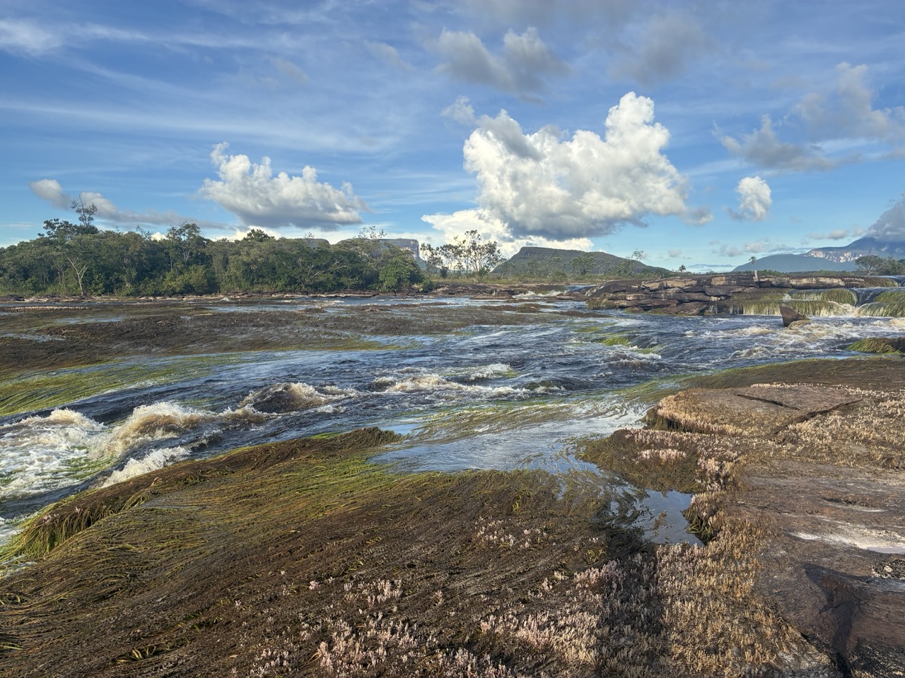 After a couple of hours we made a right hand turn into the Rio Churun. It was a much smaller river and seemed to flow a bit faster. And it was shallower. And had interesting collections of big round white pebbles as well as the odd sandy beach.