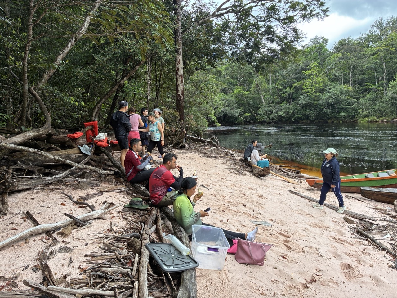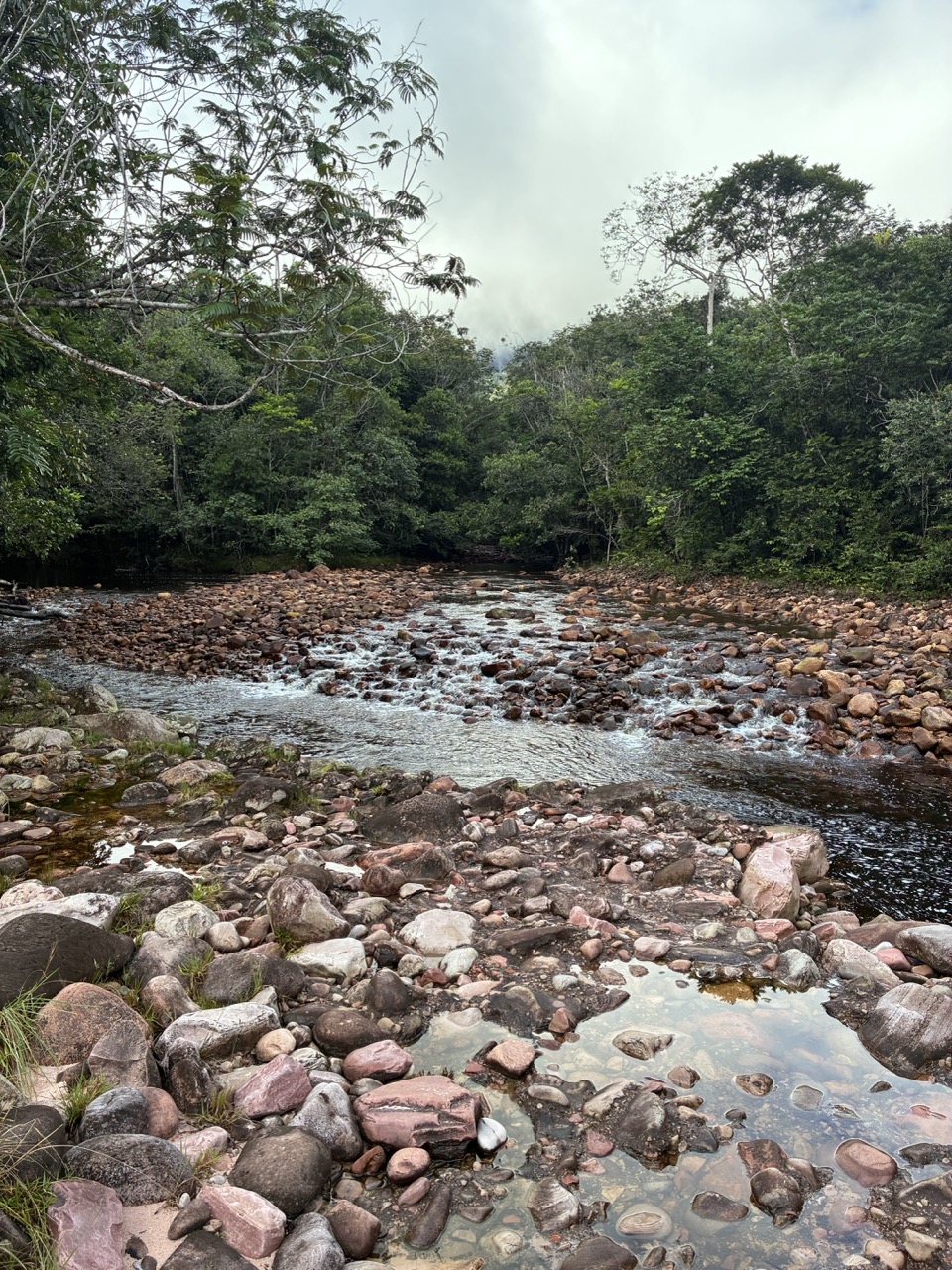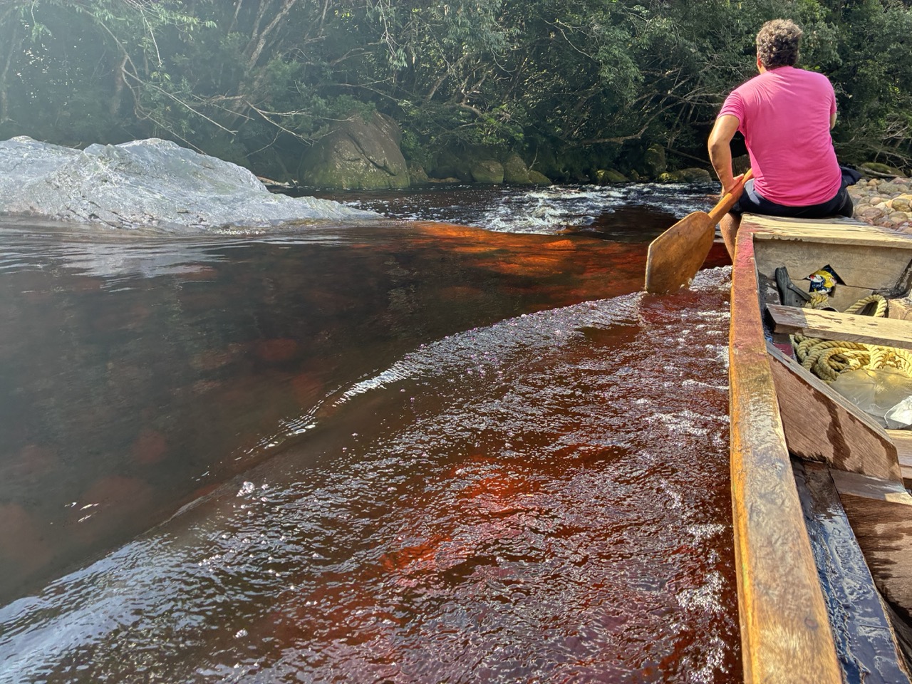 After a couple of hours we made a right hand turn into the Rio Churun. It was a much smaller river and seemed to flow a bit faster. And it was shallower. And had interesting collections of big round white pebbles as well as the odd sandy beach.