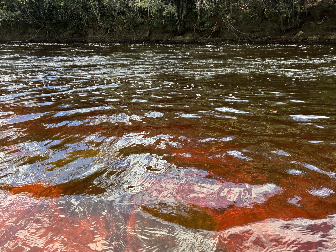 But then on one rapid we were almost through it and despite a screaming motor we started going backwards. He looked panicked and jumped out of the boat into the chest deep water and tried to stop it singlehandedly. That didn’t work. We were going motor first back into fast water. I zipped my phone into my jacket pocket and held a good grip on my dry bag. He then jumped back on the boat and used his big paddle as a rudder to navigate us safely backwards through the rapids, rocks, and fallen trees.