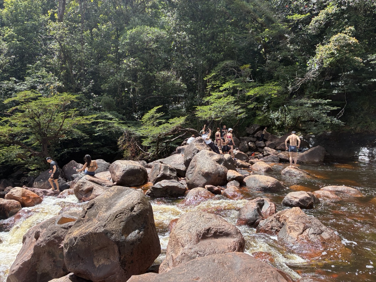 On the fourth attempt the big guy was paddling as well and we just got through to flat water. Everyone clapped and there was smiles and relieved faces all around. We continued upstream as the river narrowed yet again and almost looked like it disappeared in some places but we went left then right in things that looked like a stream and somehow ended up in a river again.
